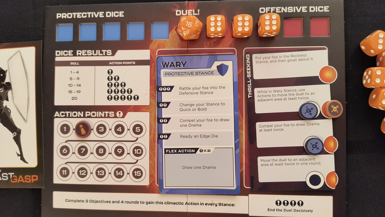 The game ends when one player completes three of the four objectives on their objective card, and then has four action points to “end the duel decisively”. This doesn’t necessarily mean winning the duel, but instead choosing the result. It could even mean the player taking the action surrenders, or runs away. The duel ends, one way or another.