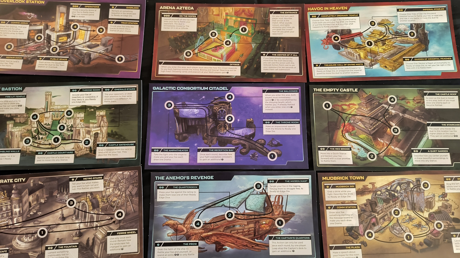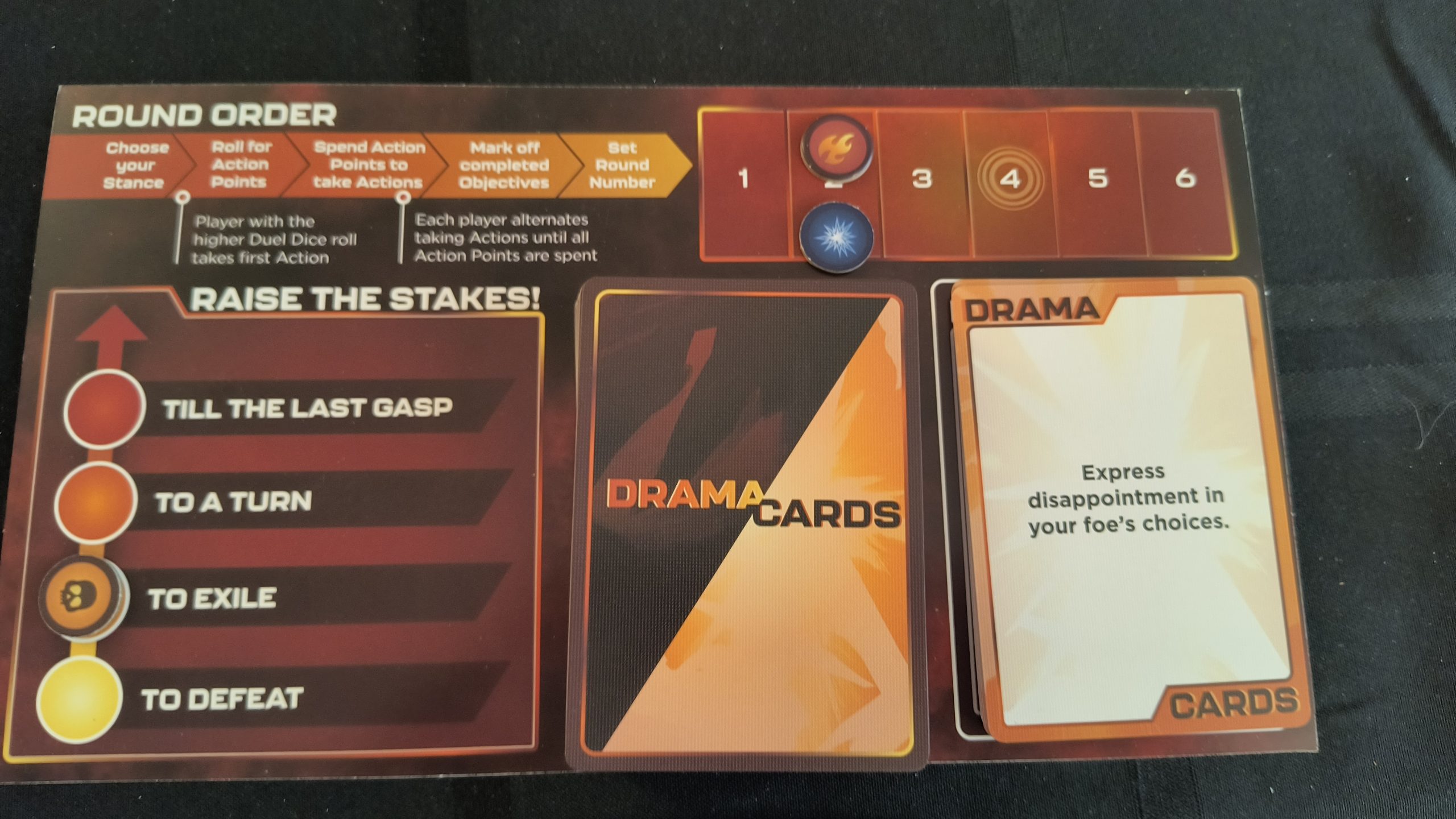 Players take turns using their action points to take actions chosen from a list on their stance card and the location the fight is in right now. These actions will allow players to break scenery, wound the other fighter, move the fight around, force a player into a new stance, or possibly force the opponent to draw a drama card, which is an opportunity for roleplay.
