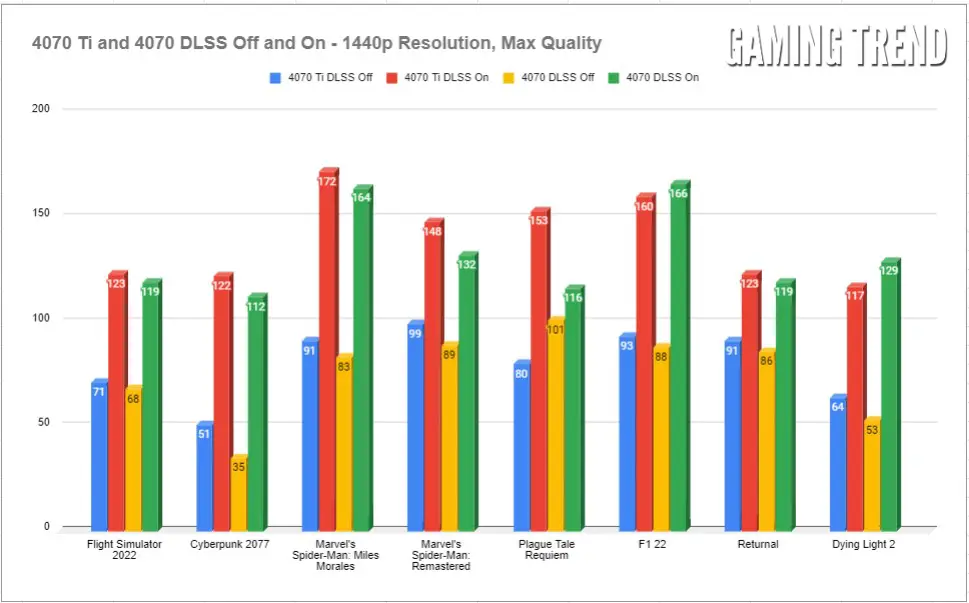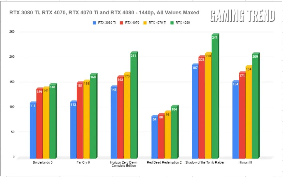 Let’s be honest and state plainly that most games don’t support high refresh rates at high resolution. Likely your GPU will fall short of the task, with only very old or very simple games able to reach anywhere near the need for 240Hz refresh rate – at least at 4K. No, the sweet spot for this generation is 1440p, and that’s precisely where the Titan Army C32C1S does its best work – 240 Hz at 2560×1440. Let’s take a look at the performance across several current cards at max settings and 1440p: