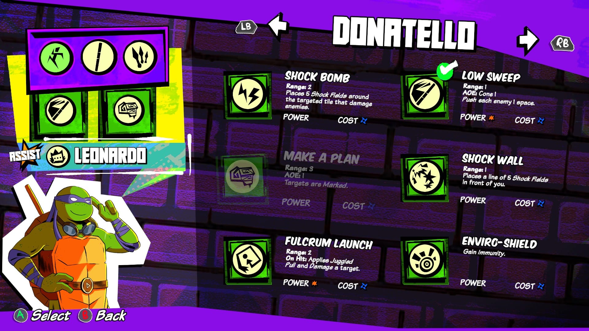 Each level sees you play as a different member of the TMNT family, with their own sets of abilities, action points, and 3 continues. The abilities generally see you moving, attacking, inflicting status effects or traps, and pushing enemies. The pushes are the most reliable abilities in the game; because every level is so small, you can push nearly anything off, killing them instantly. Except for rare unmovable enemies that don’t appear until late into the game, this is the most efficient way to use your action points. A 5 health enemy will go down in one hit, saving immense time and resources.