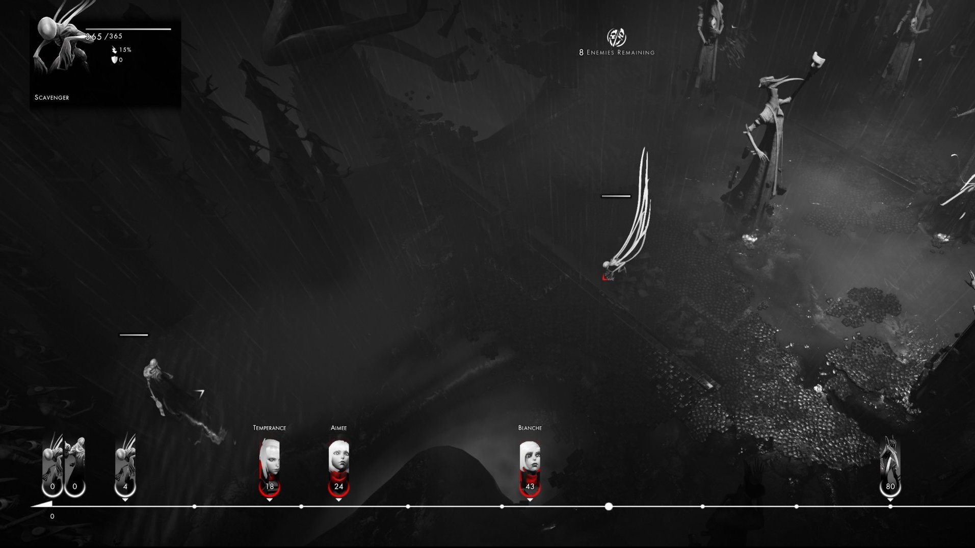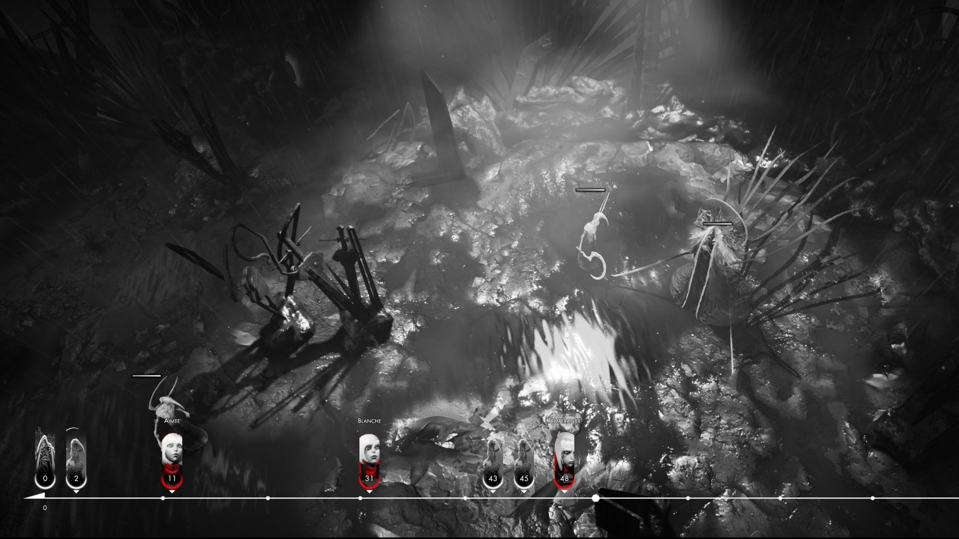 Othercide has a unique spin on the typical tactical rpg. While you still have Action Points, points that determine how many moves you can make during your turn, they are done a bit differently. You have access to more points than you will generally use a turn because if you go past 50 points in a turn, you are placed higher up on the timeline. What’s this timeline? It determines the order of turns and is a key element of the game. You have abilities that can push yourself forwards to get another turn sooner, push enemies back to delay there, and you have delayed attacks that don’t activate until later on the timeline. This timeline is a fantastic idea that is executed well. Enemies and your Daughters die in just a few hits so you must maintain control of the flow of combat.