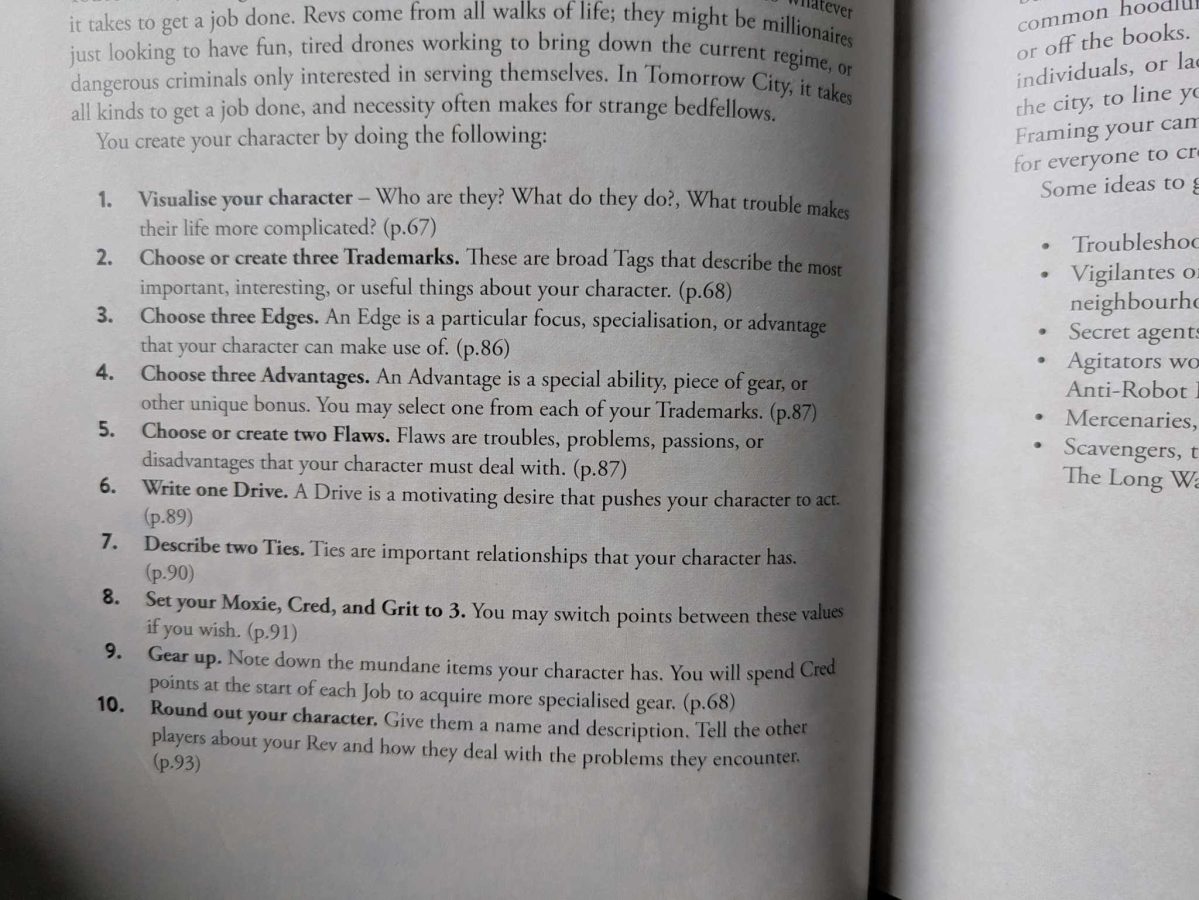 I don’t need to explain character creation, because the book adequately does that on its own. Gander if you will at page 66 below. You see that? You see how everything is laid out concisely in a single page with direct references to all of the information you’ll need for the other steps? This is how you deliver information in an RPG book. Not several pages of meandering, nonsense text. A list of the steps you need to make your character. RPG sourcebooks have plenty of story and visuals but for the sake of all that’s holy, they are also rulebooks. They are technical manuals, and obscuring rules is a waste of time and effort by the author on behalf of the player. Thank you Nathan, I was starting to go insane. There is no excuse for doing worse than this. If you can’t break down character creation, indeed the base mechanics to your game as a whole, into a concise, useful summary, you have no business writing any RPG.