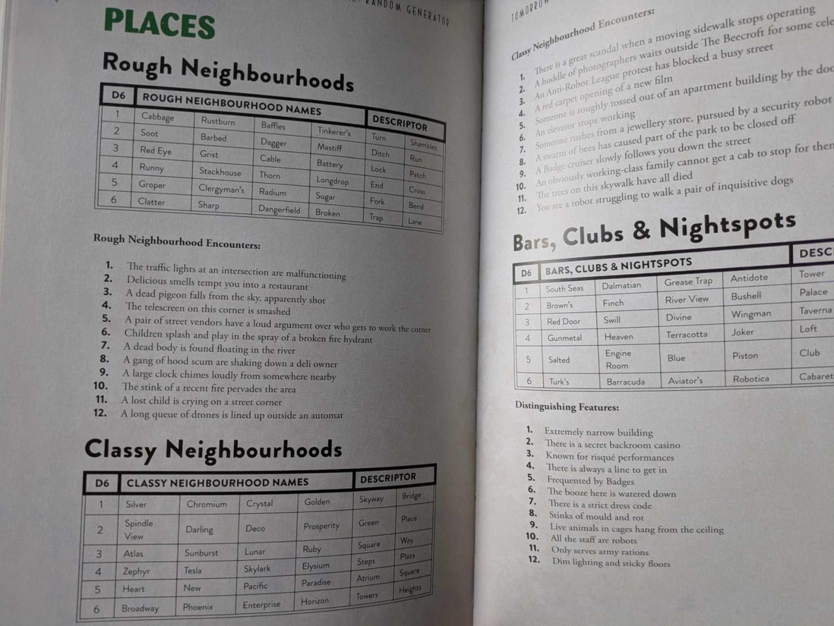 The book continues with a brief but captivating adventure, which sees you interacting with the local authorities and seeing some of Tomorrow City’s more fantastical sights. At the end is a nice series of Appendices which summarize important information and give you resources like generating random jobs or hooks.