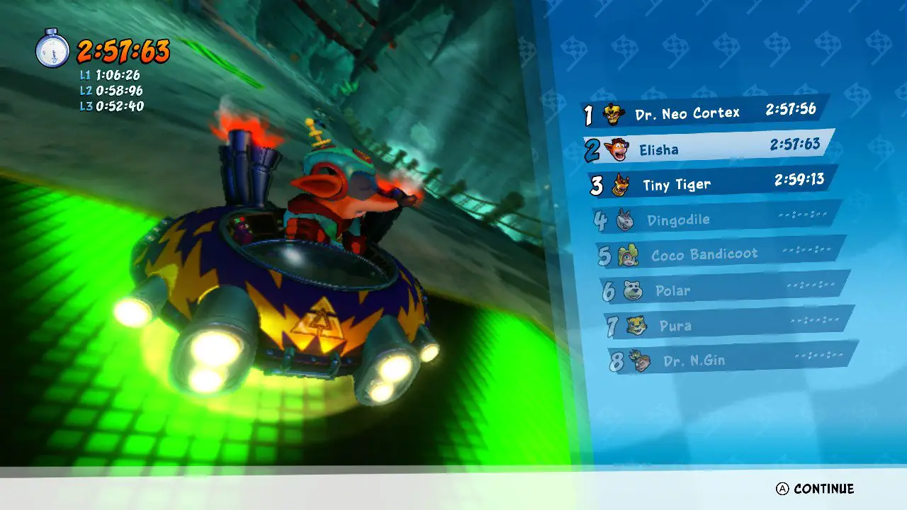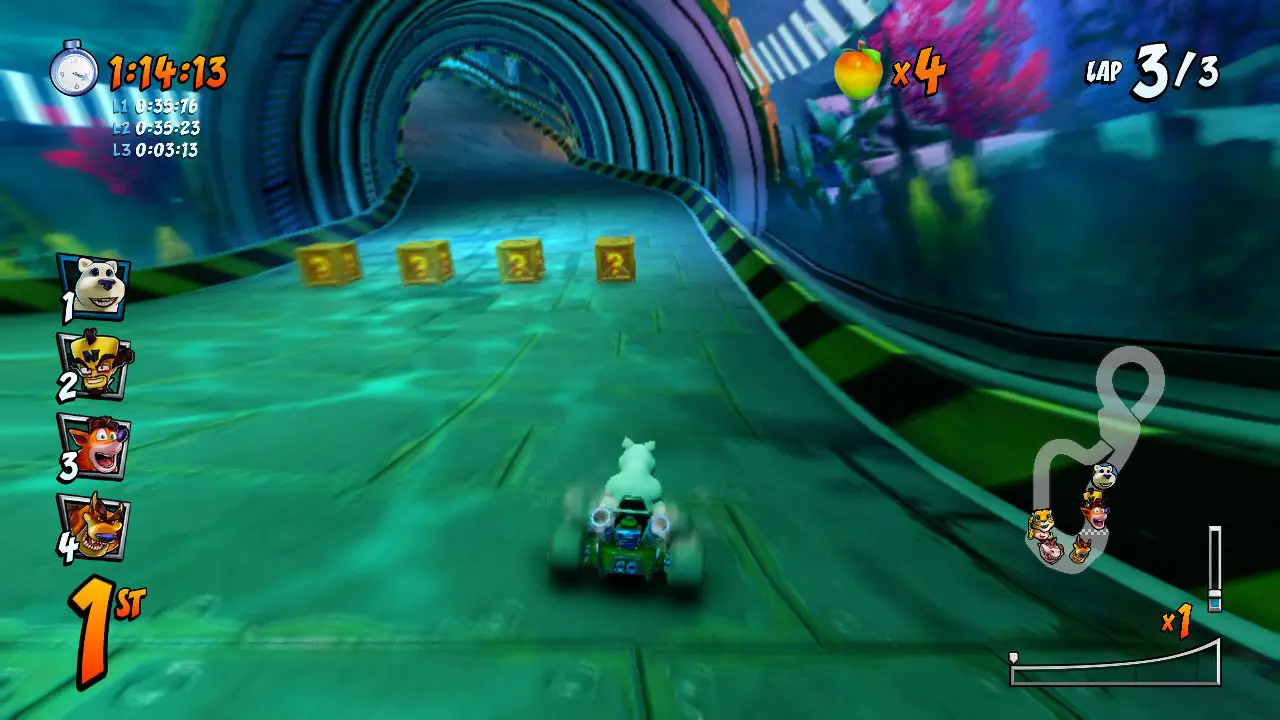 While midgame and endgame tracks are tough but mostly fair, there was a good amount of rubberbanding AI. This is noticeable enough to be unfairly frustrating in later tracks, especially when the characters that are overpowering you normally shouldn’t. Mystery Caves was one such example, where I would get overtaken easily by Pura or Polar, even though they normally have absurdly pitiful top speed. The terrain also doesn’t lend itself well to drifting, so I was stuck on this track a few times before I ended up switching to Crash and barely getting first place. Due to how handling works, controls for drifting are ironically a bit inaccurate for the characters who have excellent handling. Coming from something like Mario Kart, there was a weird delay with locking the character into a turn, and oftentimes it meant that I would spin out or just not do a drift, wasting precious seconds and having opponents overtake me. This is less apparent for expert characters (whose drifting abilities fit more in line with Mario Kart, albeit more inaccurate), so I just wish this issue could be rectified later.