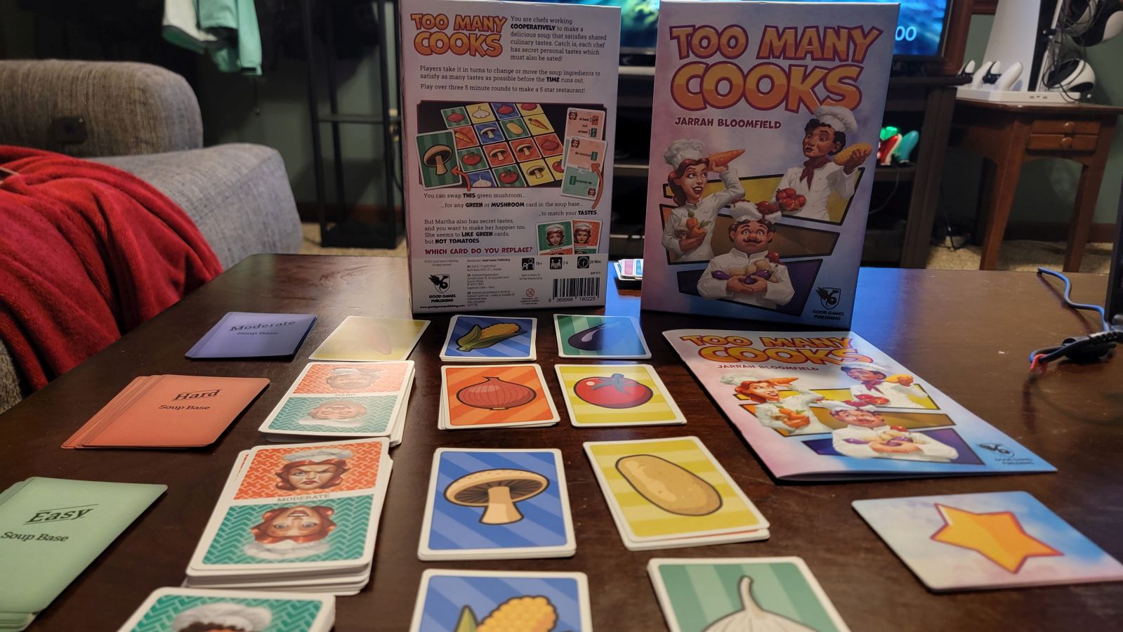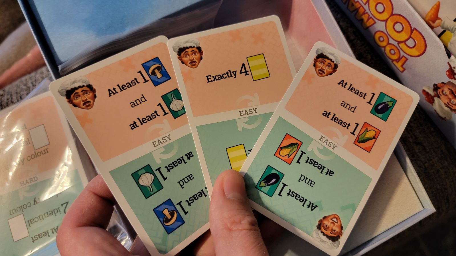 While simple in concept, Too Many Cooks is surprisingly complex once the timer starts counting down. The first time you play you will find yourself in a frantic rush, grabbing and exchanging cards, and very likely making a mess of the board in the process. If you’re anything like my group, at the end of the first round we found we had played the game almost entirely wrong, as we hadn’t realized taste cards not only had specific vegetables on them, but also specific color cards we had to match up. Subsequent games we found ourselves remaining far calmer as we took our turns, and as such we began making progress and watching our star rating rise.