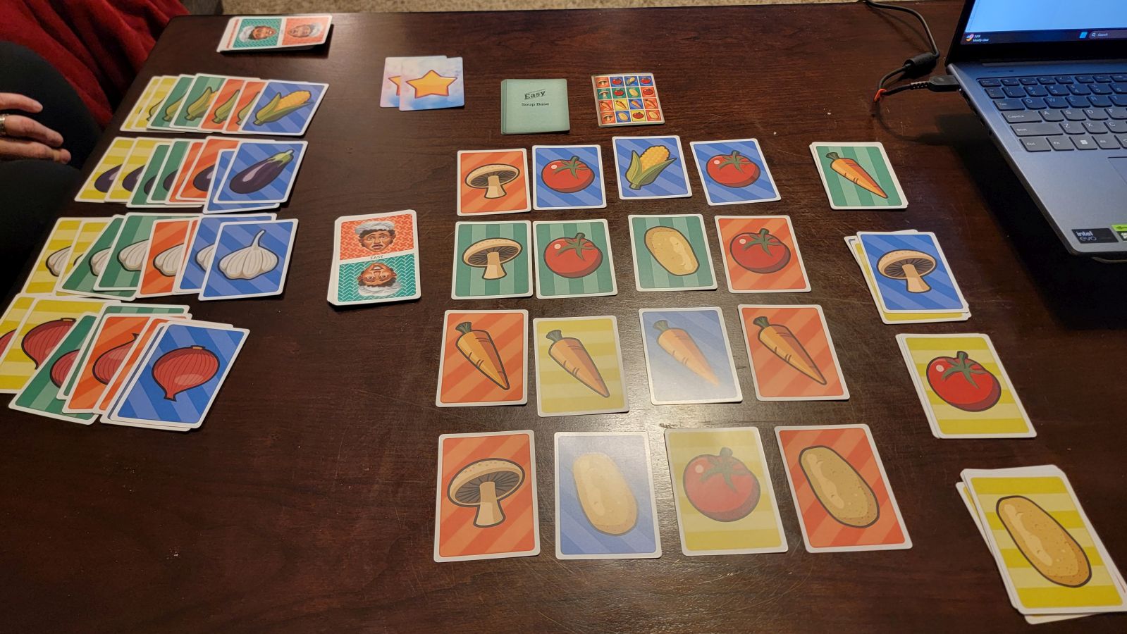 You begin by placing two star cards on the table as this will serve as your restaurant’s rating. Your ultimate goal is to reach five stars throughout the three rounds, which is far easier said than done. You must now choose a difficulty and shuffle the corresponding taste cards. I highly recommend beginning at the easy level and working your way up each time you obtain five stars, otherwise you’re in for a rude awakening on just how frantic this game can be. Now you need to lay out all vegetable cards, with the game recommending laying out four vegetables on each side of the table with a four by four card space left in the middle for the soup base. When you lay out the vegetables they need to be splayed, so you can easily see all available colors, and each line of vegetables should be laid out in the same color order.
