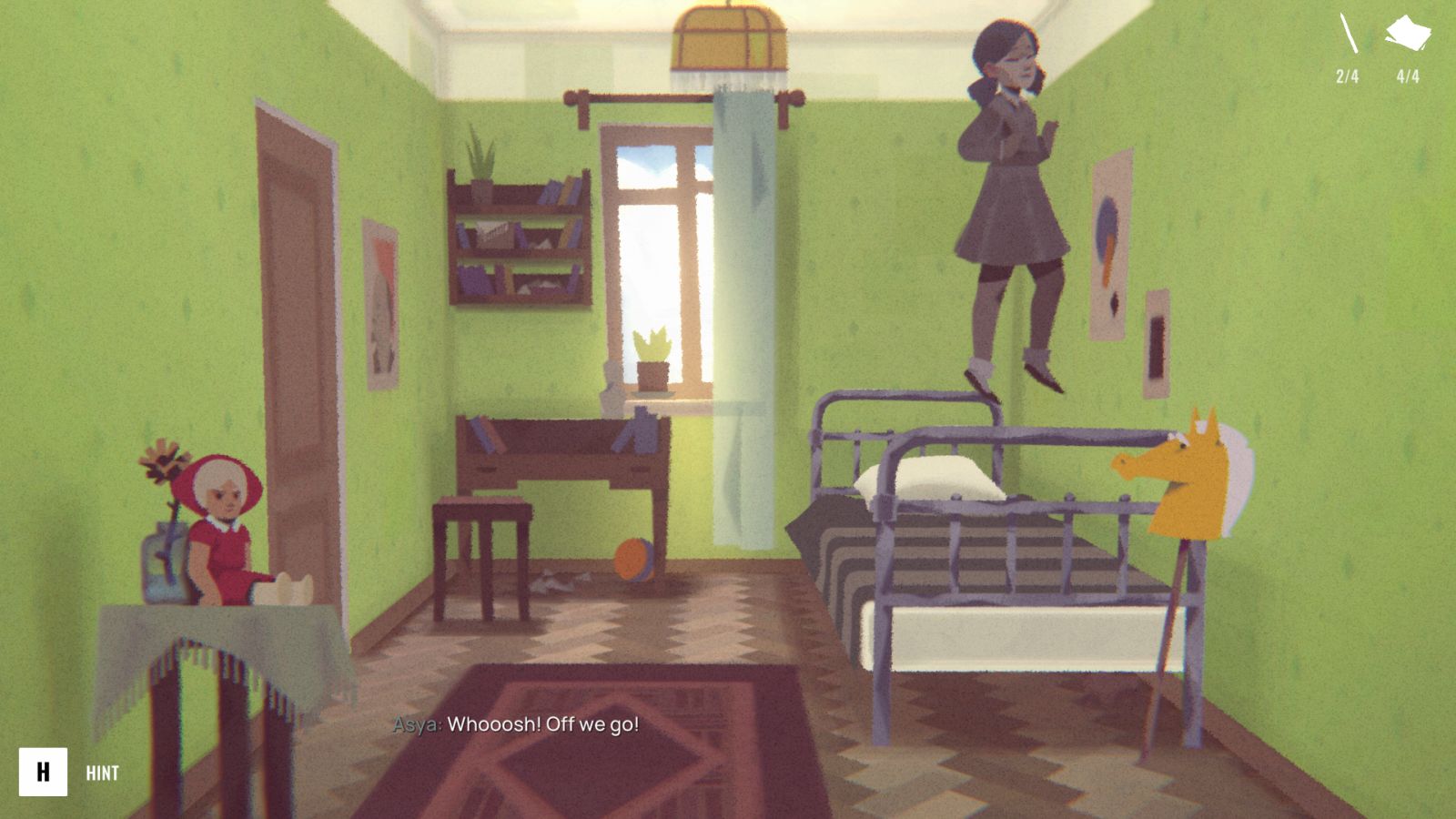 Asya talks with her toys, a yellow hobby horse named Arkady and a red doll named Madame. The former is rather kind to Asya and offers her words of assurance while the latter is belligerent. The toys are stand-ins for her parents and how she perceives them. On top of your toys, you also have a diary, where notes and drawings will be added throughout the game.