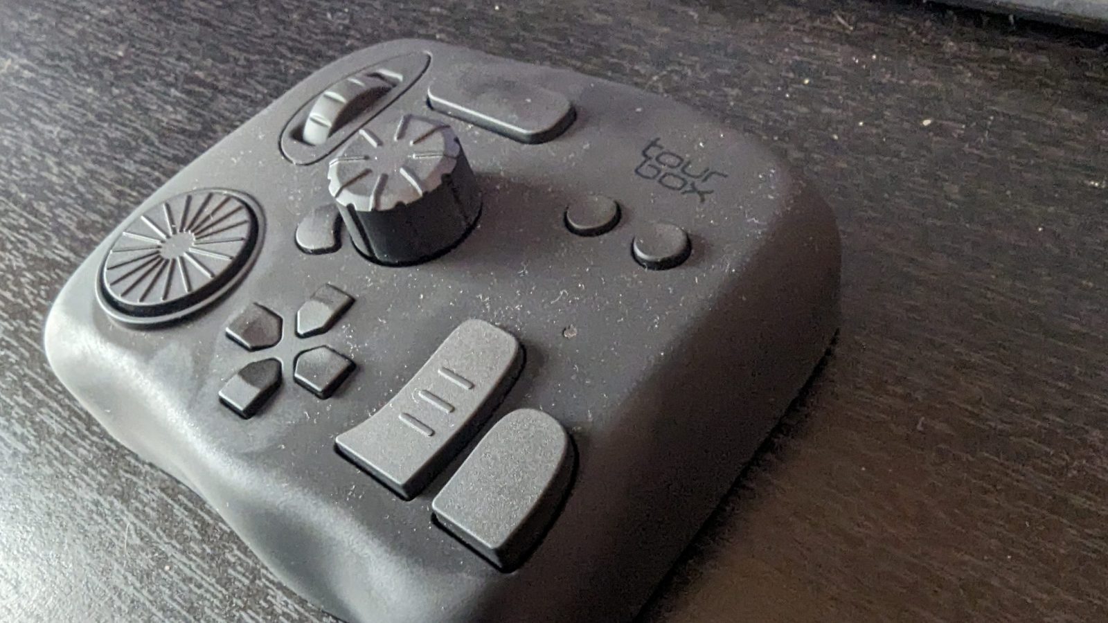 The TourBox has 14 buttons, including pressing down on things like the scroll wheel. There are three spinny bits: a large knob in the center, a scroll wheel in the top left, and a flat dial in the bottom left. Having big buttons in the bottom right, a big top button, and a D-Pad under the knob make them easy to reach while turning the knob, but the scroll wheel and dial do require some hand movement to use comfortably. In the top right, there are two much smaller buttons which work great as undo and redo, there’s another small button next to the knob that I often forgot about, and, finally, there’s a button on the side, which I find functions best as a “shift” key to change the function of other buttons while it is held down with your pinky. (I should note I’m using this with my left hand, and my mouse in my right, my left hand moving to the keyboard when needed.)