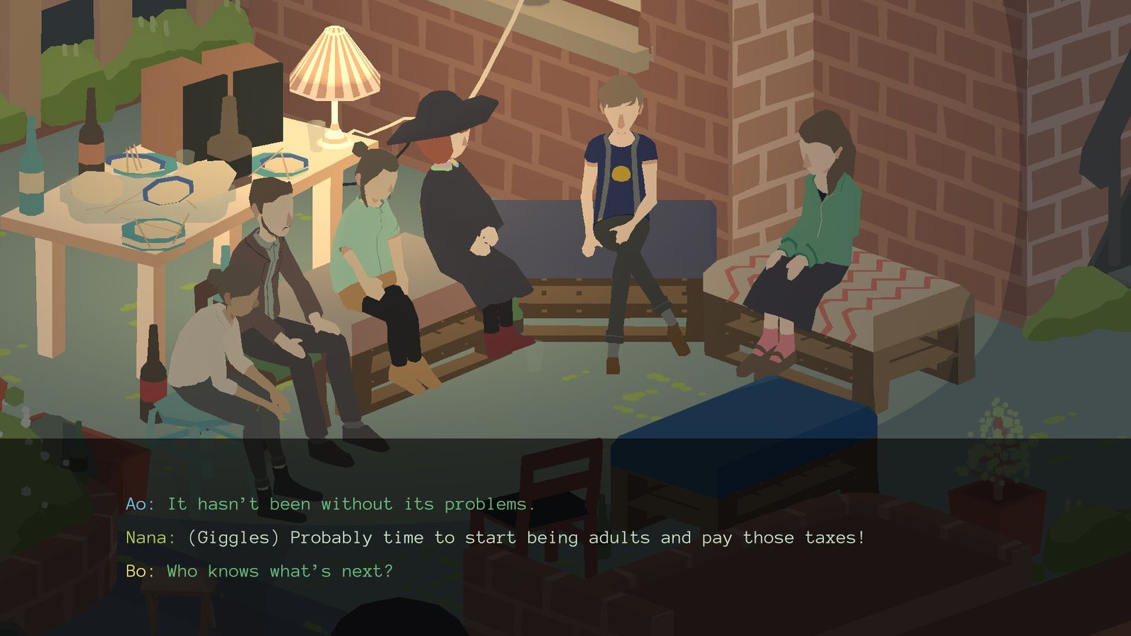 The rest of that time is spent in conversation with friends or one another. The dialogue options are an integral mode of interaction for you, but the trick here is that the player’s choices determine not just what’s said, but who says it. You’re not really speaking as any of the characters, more like choosing whose voice is heard. For such an intimate, character-oriented game, keeping a little distance between the player and the protagonists is an interesting choice, but one that I think pays off. Bo and Ao take turns as focal characters, but you’re never meant to become them, to step into their shoes. You’re already connected by this collective angst, so, in a way, you’re joining in on the conversation. The choices you make won’t influence the direction of the story, but they help you process the questions and themes of the game.