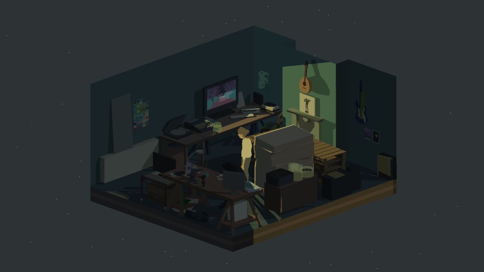 Bo is a native Londoner, Ao is a Japanese international student. Both were hoping to snag the jobs promised to them as graduates, and both were rudely reminded of the systems working against them. No Longer Home follows the pair as their cozy university life together comes to a close. You alternate between controlling Bo and Ao in a highlight reel of memorable moments leading up to their inevitable departure. A bulk of your time is dedicated to exploring their home and interacting with mementos of their school life. Like them, the flat itself is in a transition period, communicated through the level design and a light sprinkle of magical realism. Pieces of each room float gently into place when you enter, or rearrange themselves as the story progresses. Sparse drums sit below spacey Rhodes chords or lax string melodies that lay on the melancholy thick. The ambient sounds of the city bleed into the mix as well, accompanied by little details in the sound design like piano hammer hits and guitar squeaks. The audio is half the fun. In one of my favorite scenes, for example, all the sounds are themed after a guitar.
