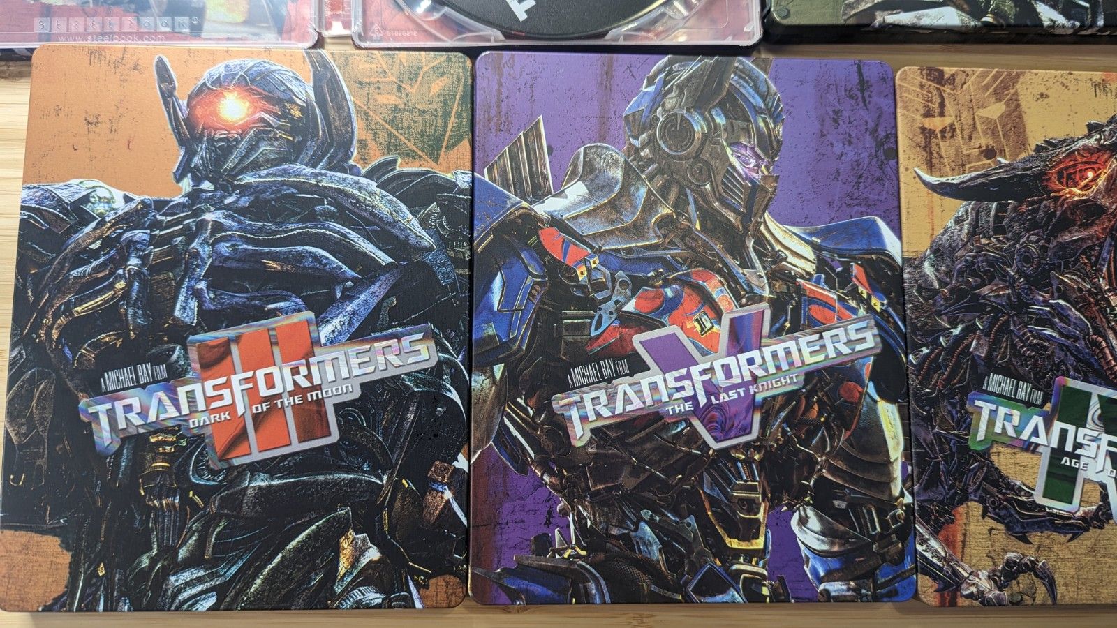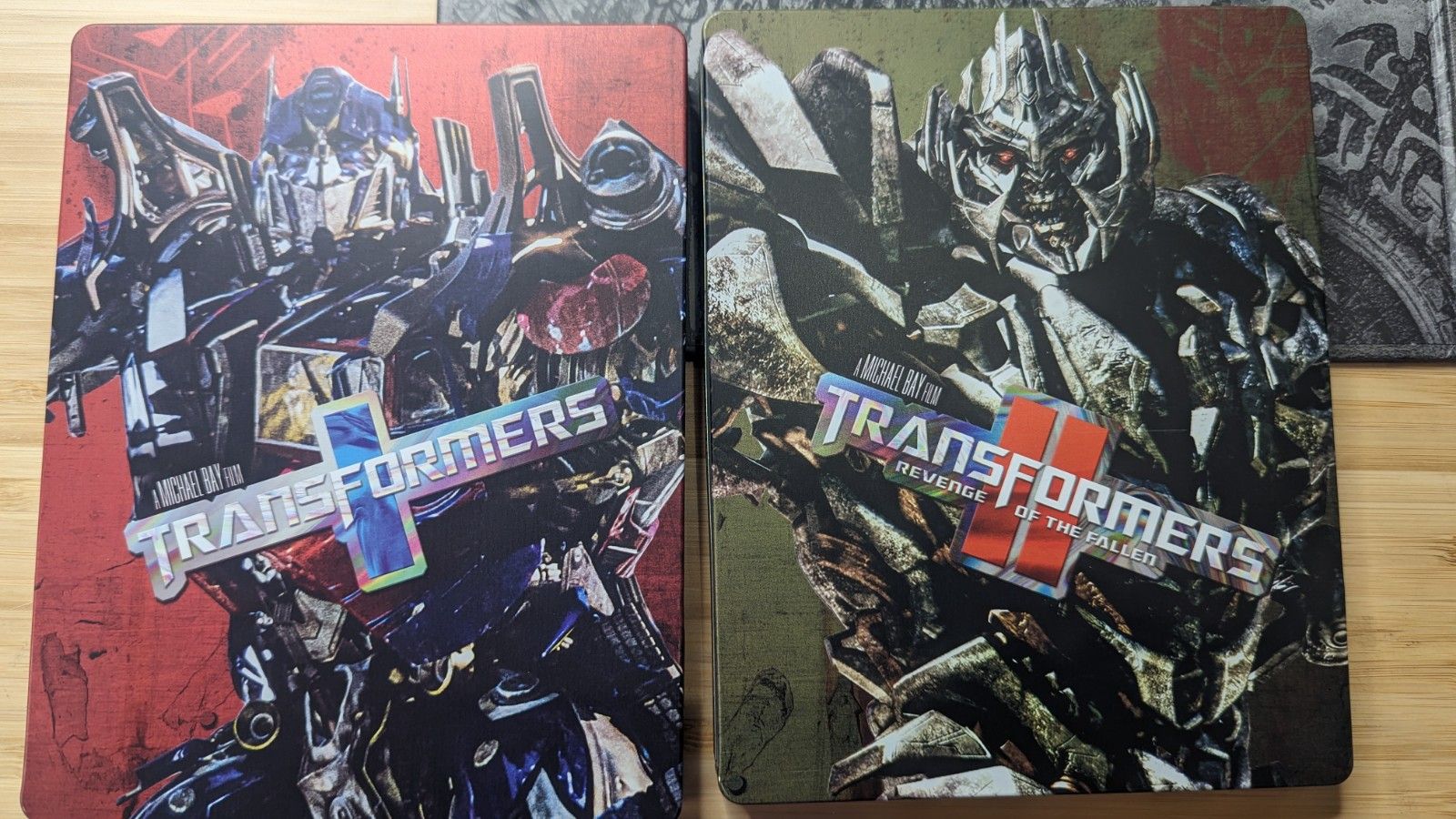 The films come in a box with foldout flap, emblazoned with the Autobot logo on one side and the Decepticon on the opposite. Opening that magnetized flap reveals an awesome surprise – six beautiful full-sized steelcases, one for each film! It’d have been very easy for Paramount to drop these onto an extended spindle, stacking the discs on top of eachother, but thankfully they are showing a great deal of care here. It’s appreciated more than I express, and with or without the box, these steelcases are a showpiece. On each is, of course, the name of the film, as well as the primary protagonist or antagonist. The film’s names are also printed on the spine, making it possible to store them with their titles facing out.