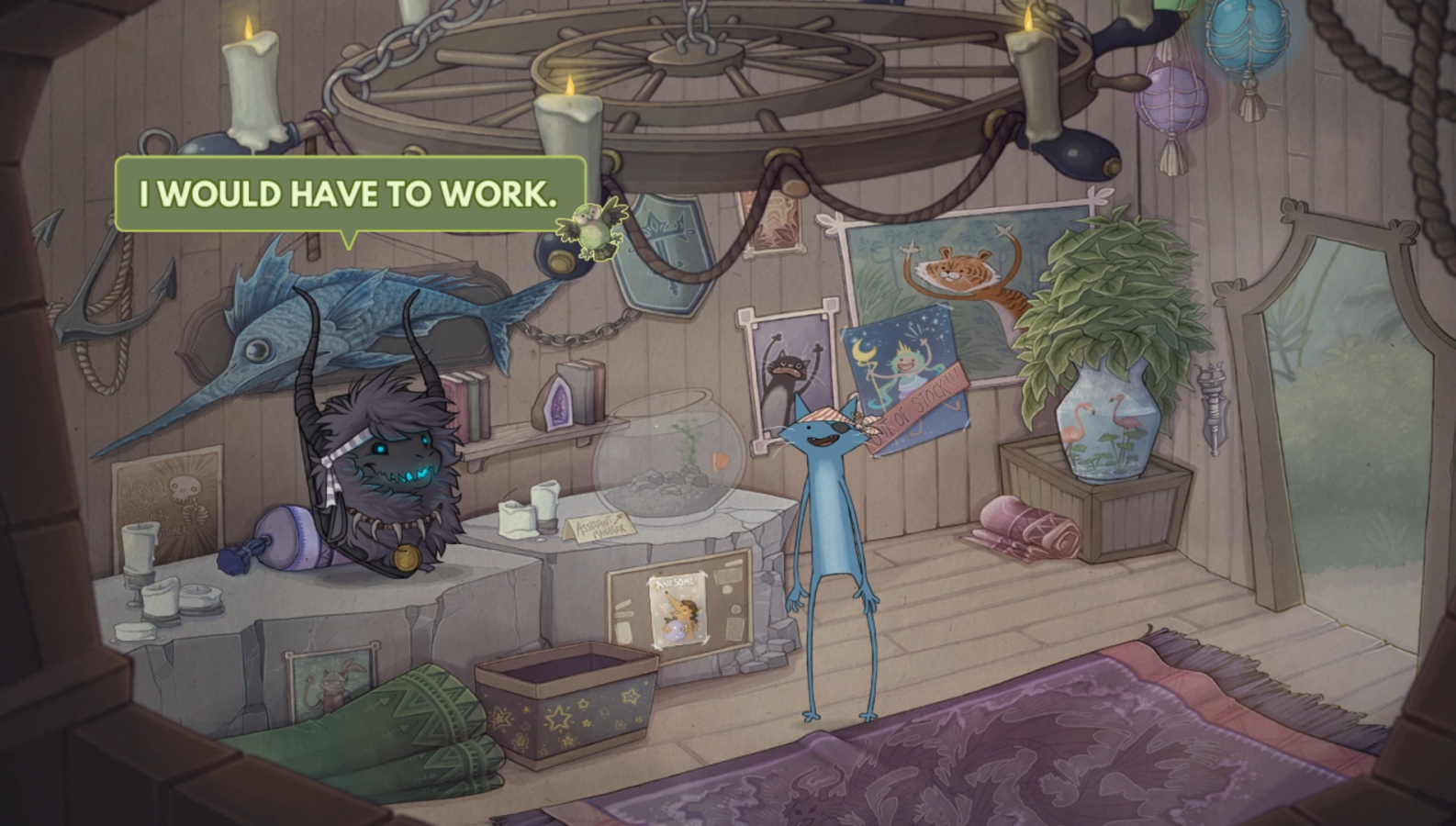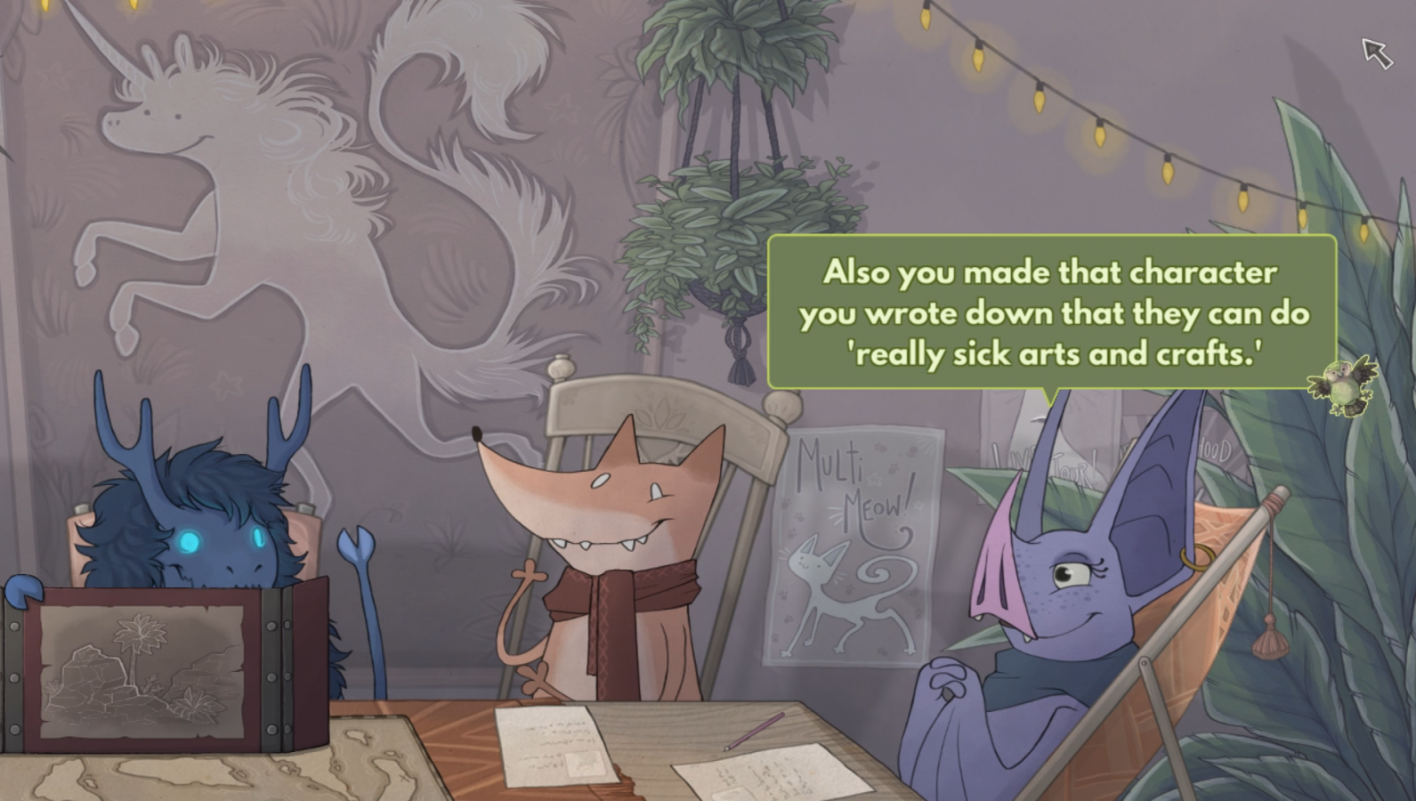 The story follows Chook the ghost chicken, Sosig the cat, Cow the undead cow, Exley the undead sheep, Hebble the fox, and Min the bat after they gather together to play a roleplaying game that Exley crafted. They are all sitting around a table, playing in a Dungeons & Dragons format (in terms of having a Game Master and an adventure they crafted). You play as Sosig as he begins the pirate themed adventure laid before the group. Exley doesn’t appear in the adventure, Chook shows up to give hints if you need them, and the other three show up in various other roles such as merchants, bartenders, and more.