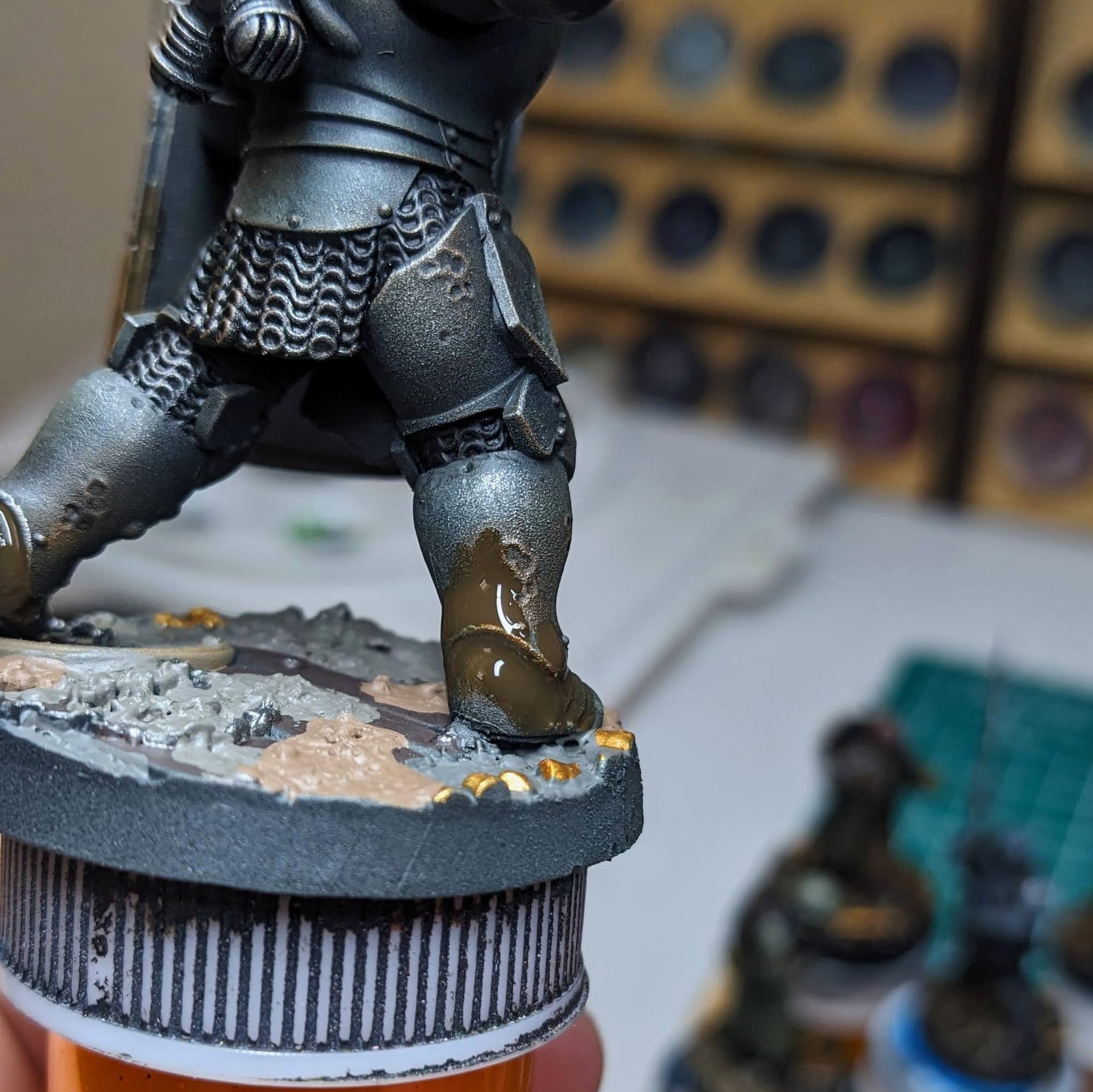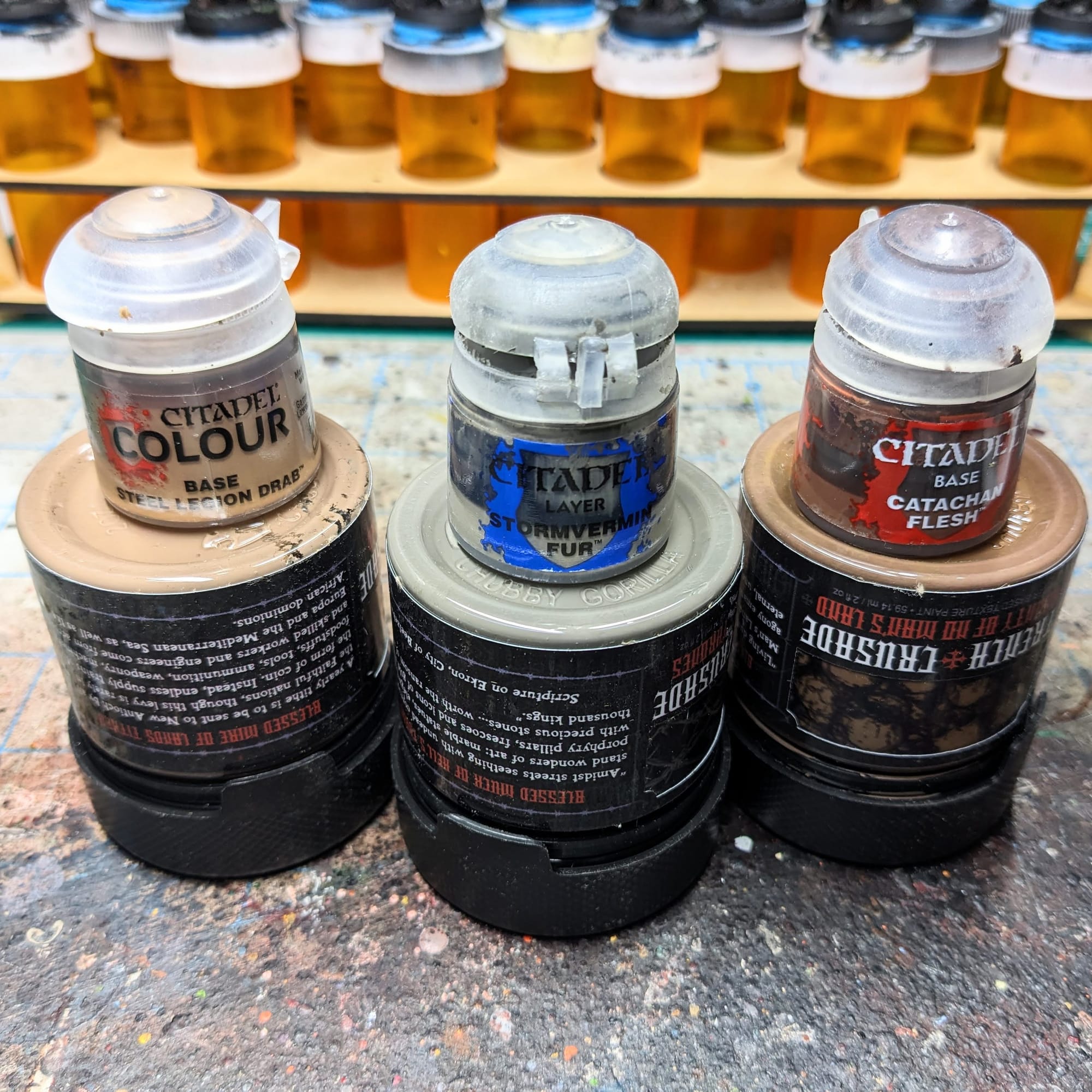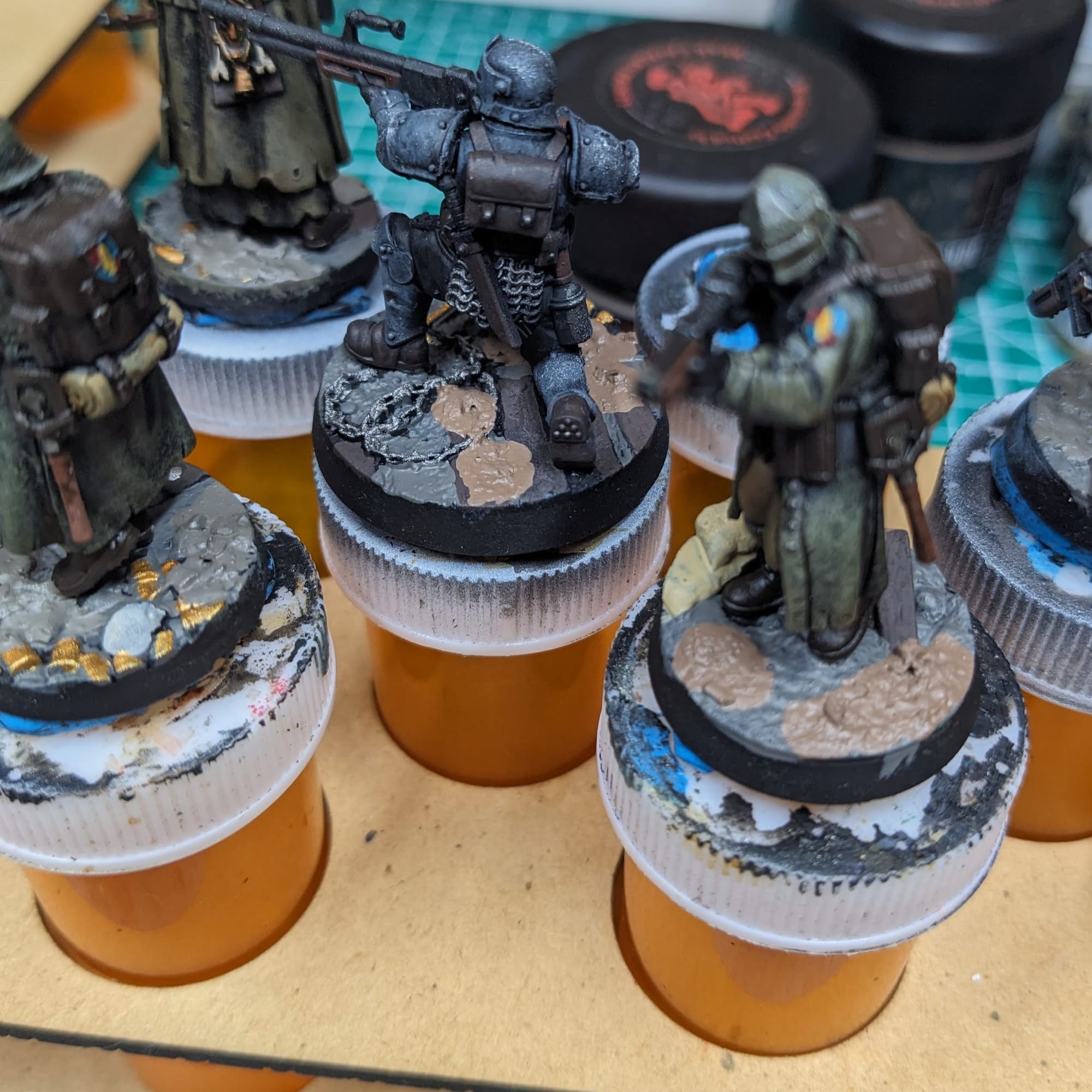 I used some Citadel paints that closely matched the texture paint as a guide for the basing itself.