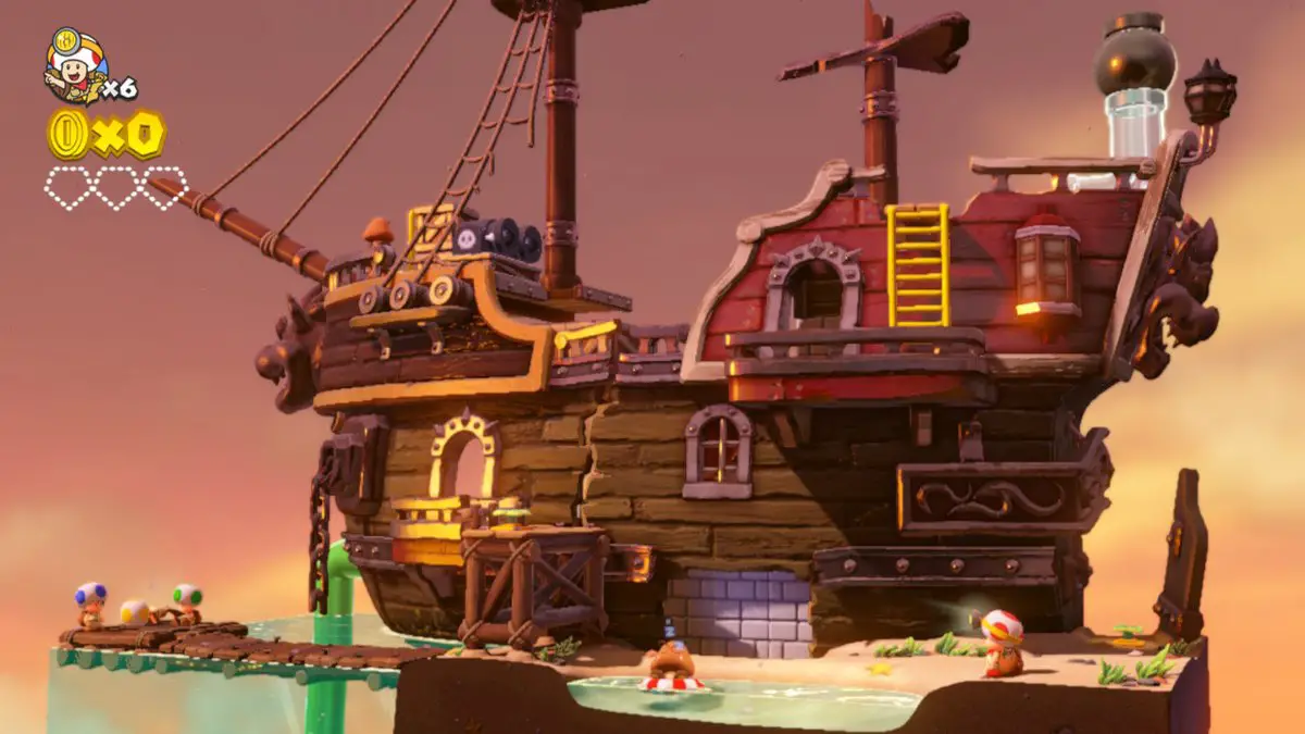 If those sound more complex than simply reaching the goal, that’s because they are. As such, this DLC felt rather refreshing, bending and twisting the established Captain Toad mechanics and motifs in fun ways. At the end of the day, you’re still maneuvering Captain Toad or Toadette around puzzle box environments, relying on your wit and careful footfalls to make up for Toad’s lack of a jump. Nevertheless, revisiting these core concepts in new ways certainly made this DLC more unique than I was expecting it to feel. Another strength of this DLC are the environments in which it takes place. From a dessert-themed island to a sunset pirate ship, these new places are loads of fun to poke around in. In fact, my only gripe in this regard is that there aren’t more brand-new stages, which speaks to the DLC’s largely truncated scope in general.