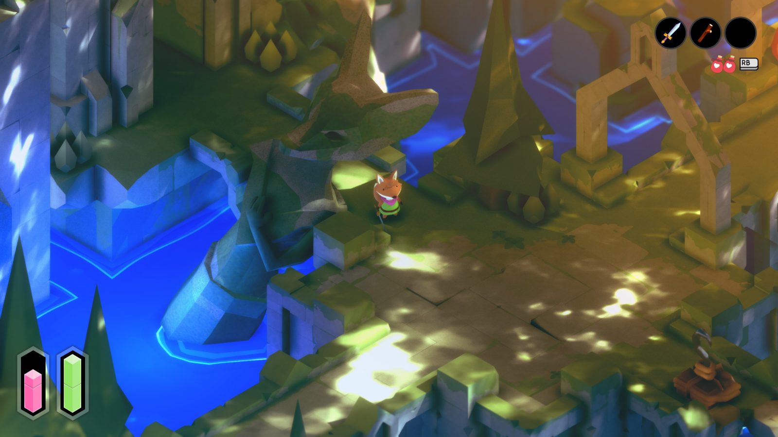 With the pervasive mystery, you are left to discover most mechanics, items, and puzzles all on your own. The game does have some familiar mechanics, however, including a Dark Souls-esque death system which leaves behind a bit of currency (it doesn’t have a name, so I call them Bits) for you to recover when you die as well as flask charges that restore your health. In the bottom left corner, you have two (later three) meters: pink for HP and green for Stamina or SP. They start off small, but you can increase them – though to say how would spoil one of my favorite discoveries. HP is pretty obvious, if you get hit it goes down and when depleted you are sent back to the last shrine you activated, but even that has some interesting twists to it later on. SP is consumed by rolling or blocking with your shield, but only regenerates when not performing actions such as drinking a flask, running, or blocking. This gives the combat a surprising depth and difficulty, encouraging you to learn each enemy and boss’ pattern of attacks (aided by the manual) to know just when to dodge, attack, or hang back to restore your stamina. It’s a lot of fun and pretty tough, but the game does have accessibility options to aid in play such as a no fail mode, unlimited stamina, or even reducing flashing effects, motion blur, and screen shake.