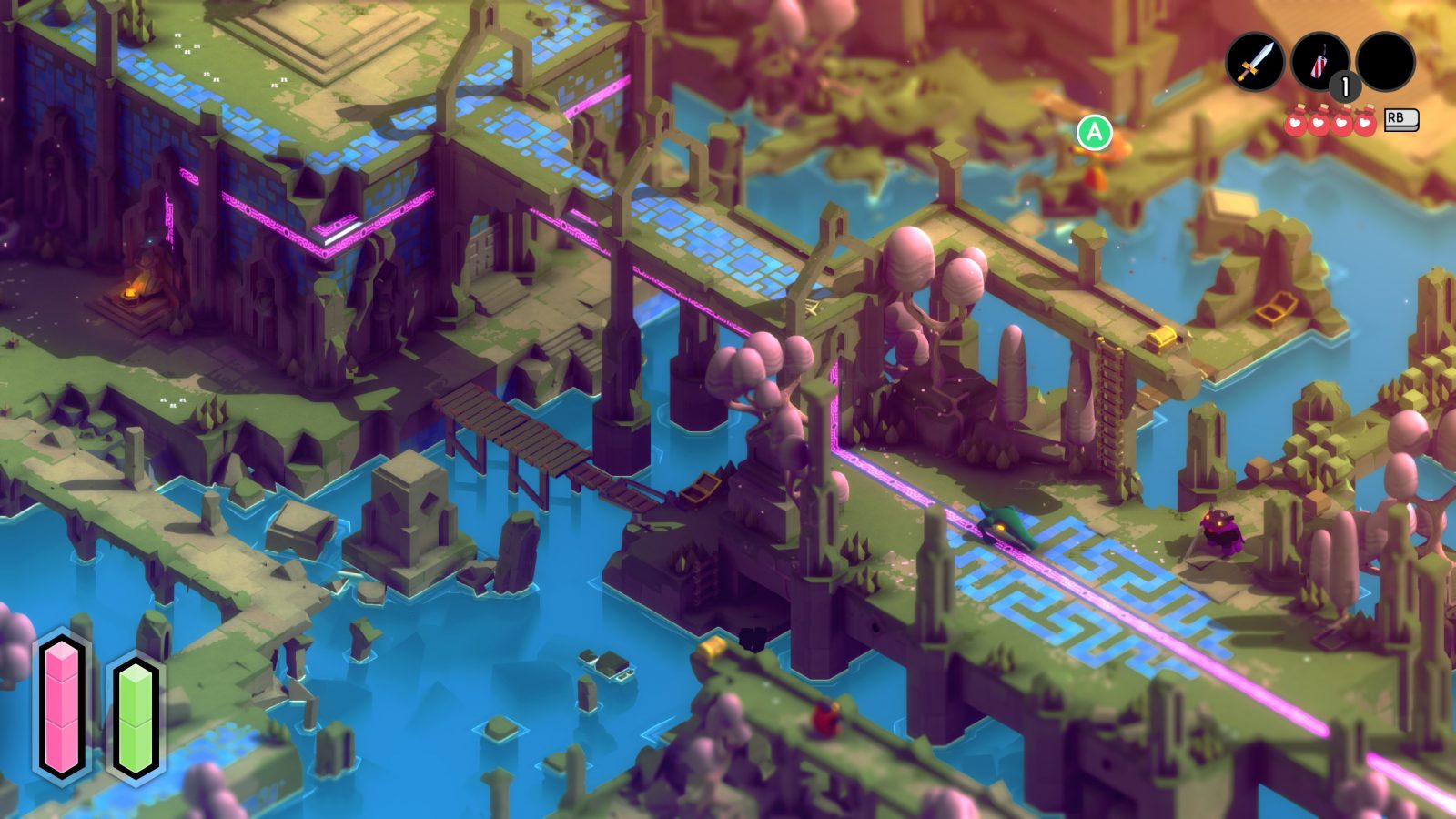 This is very hard to talk about without spoiling anything, but rest assured the puzzles in Tunic are top notch. Pretty much every single one had an immensely satisfying “ah ha!” moment and I’m still not done finding every puzzle or secret the game has to offer (mark my words though, I will 100% this game!). Thanks to the isometric perspective, there are a ton of hidden paths that lead to treasure chests containing bits to spend at shops or even new items to equip; I didn’t find the gun until 12 hours in, a bit after I had beaten the game. You’ll also find more passive items (I’ll call them Stickers) to equip in slots, the number of which you can increase through certain means. I don’t know what most of these do, but those that I have discovered can increase the drop rate of HP restoring hearts or reduce stamina consumed when blocking. Tunic has so much to see and do in its world that I’m itching to get back to it even as I write this.