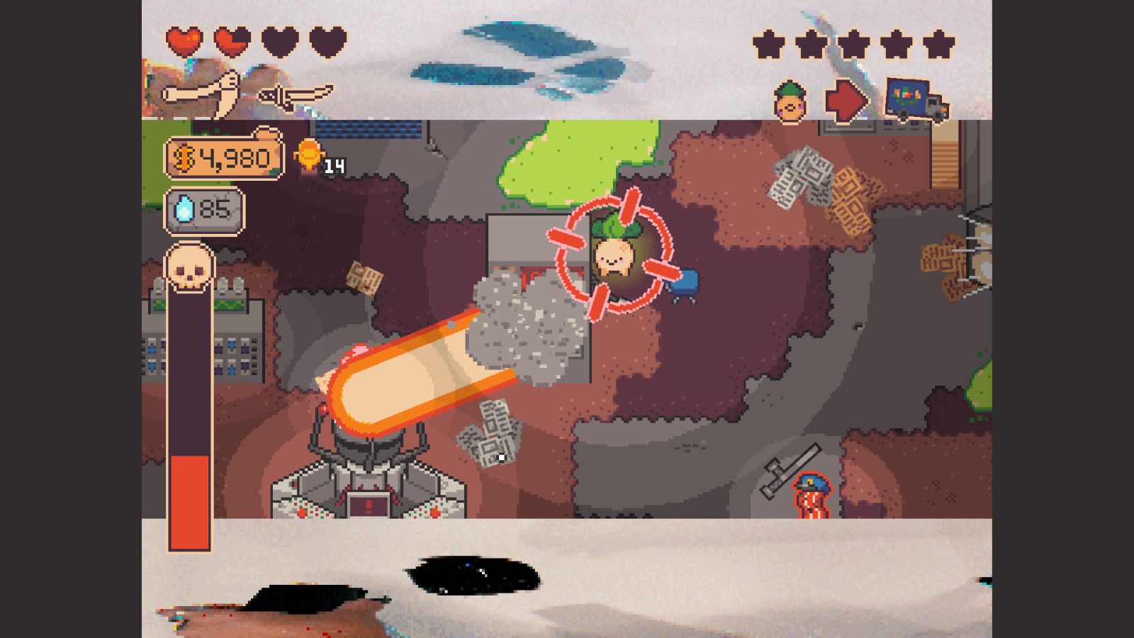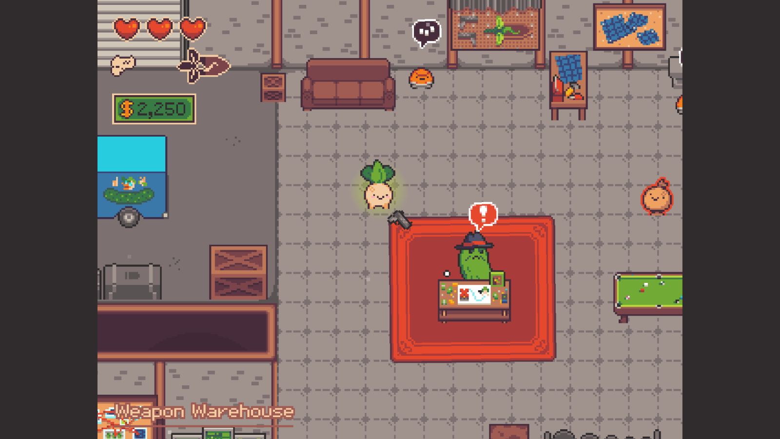 The game starts soon after the events of the Tax Evasion plot line. The Tax God burns in the distance, and you’re contacted by Dillitini of the Pickled Gang, who you might have helped escape in the first game. This is a rather significant development given Turnip Boy’s family history. From here on out, you collaborate to rob a bank, but not just any bank, a botanical bank. After the Tax God crashed down to Earth, war broke out, and now people are taking refuge in the very establishment you’re set to rob.
