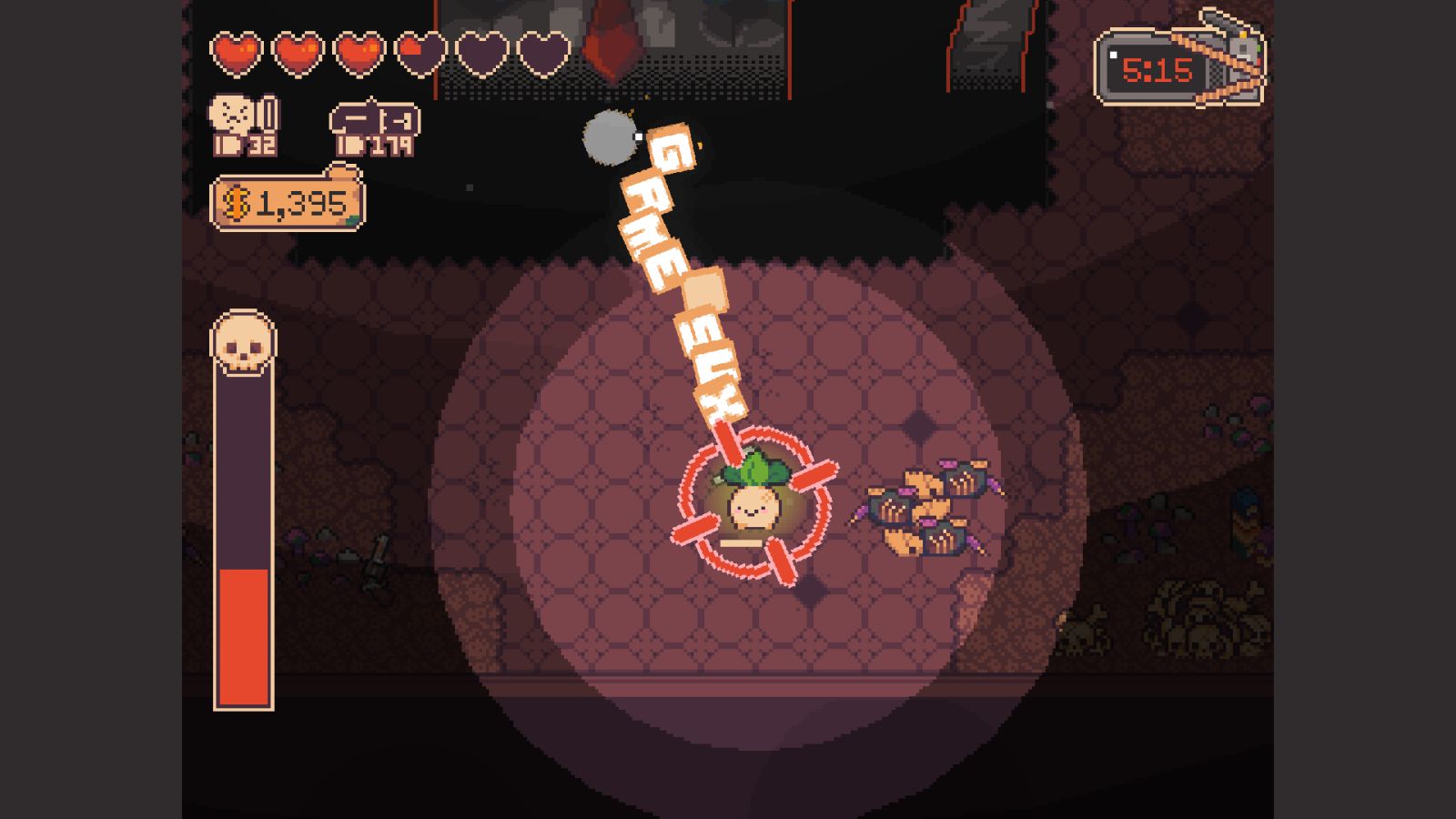 The bank is sprawling, and in order to explore all of it, you need to defeat bosses to gain key cards to access new areas. You’ll run into some familiar faces along the way, and find the continuations and consequences of many stories you participated in during the first game. This extends to your team as well, Annie the scientist takes the archetypal role of the team hacker. Of course, there’s new faces too, like Stinky, the onion who owns the bank. Helping (or doing whatever Turnip Boy thinks is helping) all of the citizens of the bank leads to some peak comedy, arguably the first game’s strongest trait. Most of the laughs still stem from the joyous husk that is Turnip Boy and his irreverent actions. At one point I just traumatized an artistic cranberry so badly I think I just created the next Junji Ito.