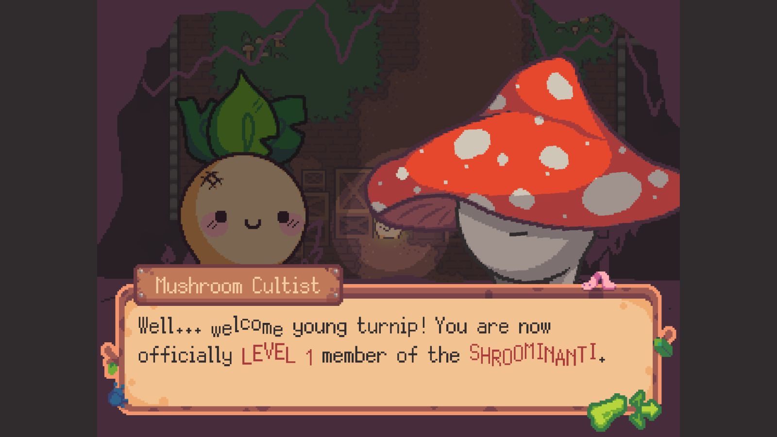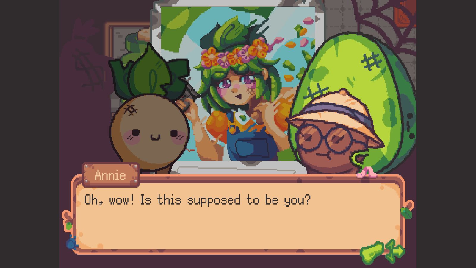 The bank is sprawling, and in order to explore all of it, you need to defeat bosses to gain key cards to access new areas. You’ll run into some familiar faces along the way, and find the continuations and consequences of many stories you participated in during the first game. This extends to your team as well, Annie the scientist takes the archetypal role of the team hacker. Of course, there’s new faces too, like Stinky, the onion who owns the bank. Helping (or doing whatever Turnip Boy thinks is helping) all of the citizens of the bank leads to some peak comedy, arguably the first game’s strongest trait. Most of the laughs still stem from the joyous husk that is Turnip Boy and his irreverent actions. At one point I just traumatized an artistic cranberry so badly I think I just created the next Junji Ito.