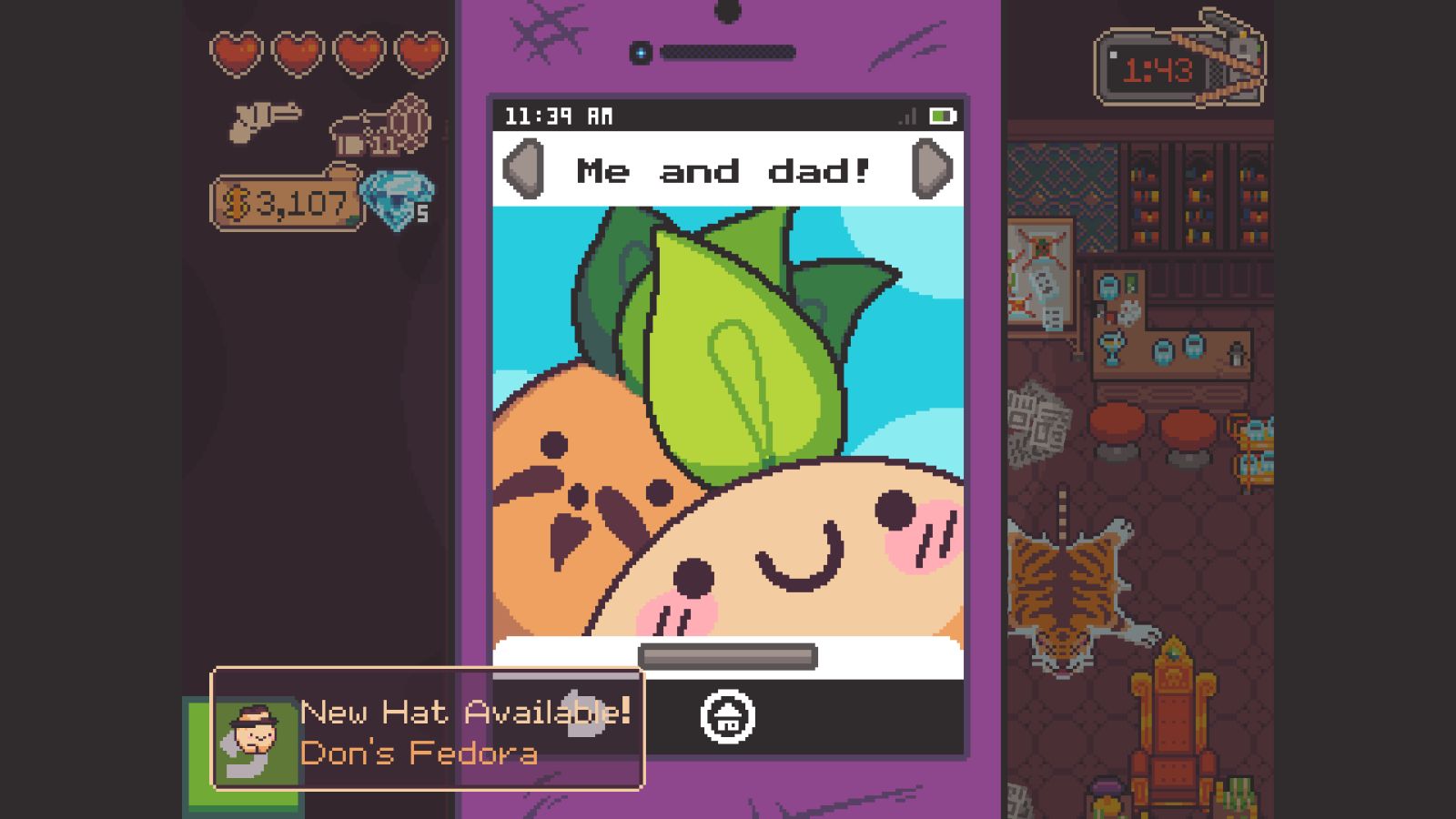 The game starts soon after the events of the Tax Evasion plot line. The Tax God burns in the distance, and you’re contacted by Dillitini of the Pickled Gang, who you might have helped escape in the first game. This is a rather significant development given Turnip Boy’s family history. From here on out, you collaborate to rob a bank, but not just any bank, a botanical bank. After the Tax God crashed down to Earth, war broke out, and now people are taking refuge in the very establishment you’re set to rob.
