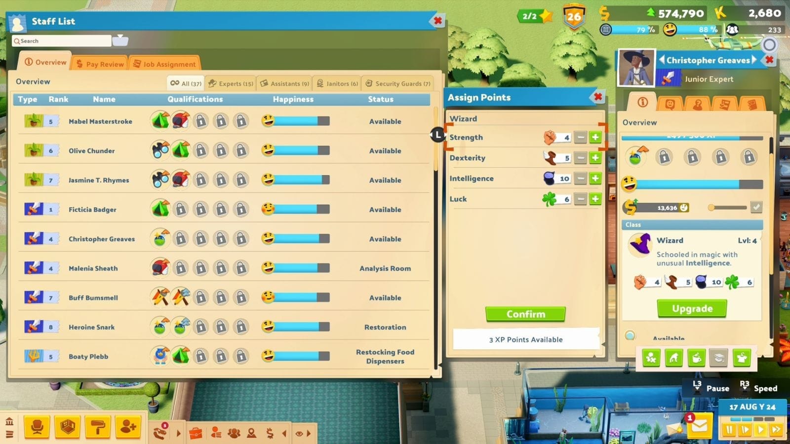 As with every other museum theme, you need to employ experts to go on expeditions and the way they work is by far Two Point Museum’s most innovative design. Normally, you employ an expert and they’re versatile in what POIs they can embark on. Their only obstacle is usually being a certain level or having a certain skill. However, Fantasy experts take this a step further in utilising stats in POIs. You are given 4 types of Fantasy expert: Rogue, Barbarian, Wizard and Bard, and they all have an affinity for one skill: dexterity, strength, intelligence, and luck respectively. The challenges you face in each POI can be negated by having a certain number of stat points in a skill. For example, to ward off money-grabbing goblins, you need 15 strength, or to avoid a curse, you need 20 intelligence. This was so refreshing and breathed a lot of new life into embarking on expeditions. To calibrate an expert’s skill, you can engage with three different methods. The most natural is simply levelling up. Every time you level up, you are given a skill point that you can put into any one of the skills. This feature was never explained in any tutorial, so it took me a while to find this. The next way is to drink stat potions that can be made by an expert with the potion crafting skill. You unlock them by doing certain challenges, but they’ll act as an item you can equip to your team so they can push past bigger challenges. Finally - and undoubtedly the coolest way - is you can use exhibits to boost your stats. As previously mentioned, you can find exhibits called Mystical Gear and each have a skill boost, the wizard hat will grant you intelligence, the winged boots, dexterity and so forth. The only downside is that once these are equipped, the exhibit is classed as empty so you don’t get the maximum potential from the exhibit. Raven utilized this weakness by having two of each item, one as an exhibit, and the other as backroom gear.