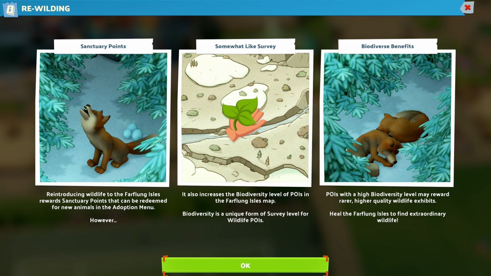 Another cool new gameplay feature is the ability to get animals you’ve already found without the expense and reliance on luck of doing the same expedition. Once you’ve found a new animal, you’ll be able to access the conservation tab, where you can spend points to adopt another. They’ll be random, so if you want a specific gender, you may have to wait for it to refresh. These points are accumulated through re-releasing animals back into the wild. At the start of the campaign, they’ll also give you some free ones to test the system. Overall, I liked this inclusion, as in every museum I play, when I'm trying to get exhibits I haven't found, I'll always end up with duplicates that will either be converted into Knowledge or sold. As this new museum has a different approach to Knowledge, the conservation system acts complementary and helped me in bulking up habitats, so I could then breed animals and, in turn, bulk up my museum.