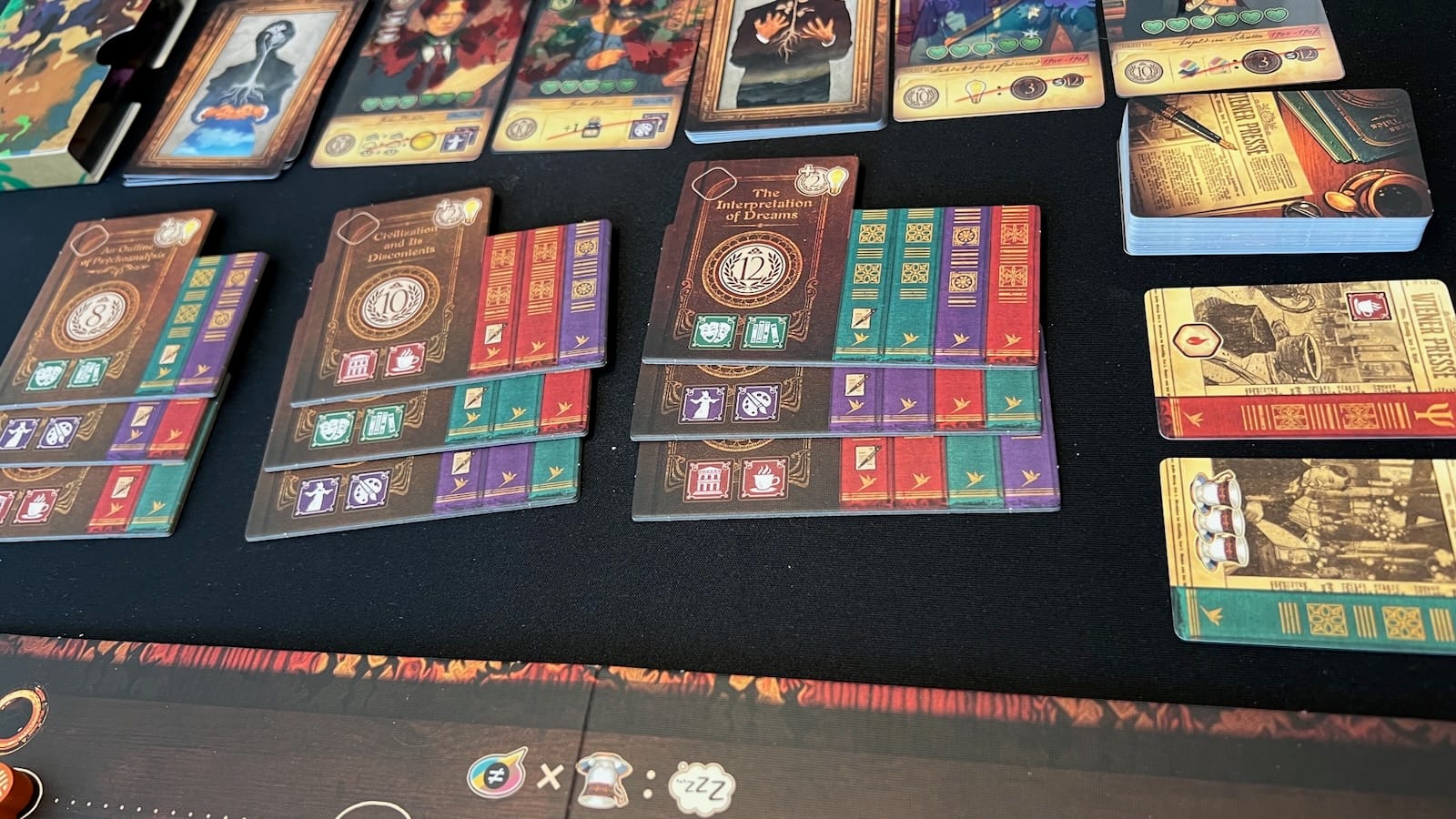 The gameplay of Unconscious Mind is not going to be for everyone, but I personally loved every minute of it. I'm not going to lie to you; there are a lot of different things you have to keep track of in the game, and it didn't click all the way for me the first time I played it. Players have to choose the right research pages and the right placement to trigger powerful combos when activated. Players need to collect different sets of icons so they can exert their influence around Vienna. You have to treat the right patients to unlock the right power ups and end game scoring to maximize your points throughout the game. For those looking for a dynamic solo experience, you will get it here, however, it adds another layer of complexity to an already complex game. It took me a couple of games to feel comfortable running the solo mode efficiently, without having to constantly look at the manual, and I am always a fan of leveled automated players vs. a "beat your own score". The players around my tables had mixed experiences. Some thought the game was too fiddly and that you had to sacrifice one aspect of the game for another. For example, the publishing aspect seemed to be an afterthought in most of the games I played, even though there were some big points up for grabs. Most people thought there was one too many systems tacked on. While I can understand their complaints, this game just clicks for me, and I love the combo-tastic turns you can develop and make work for your strategy. Depending on the options on the table, you may lean harder into one aspect to get what resources you need than another. It all depends upon your style and likes.