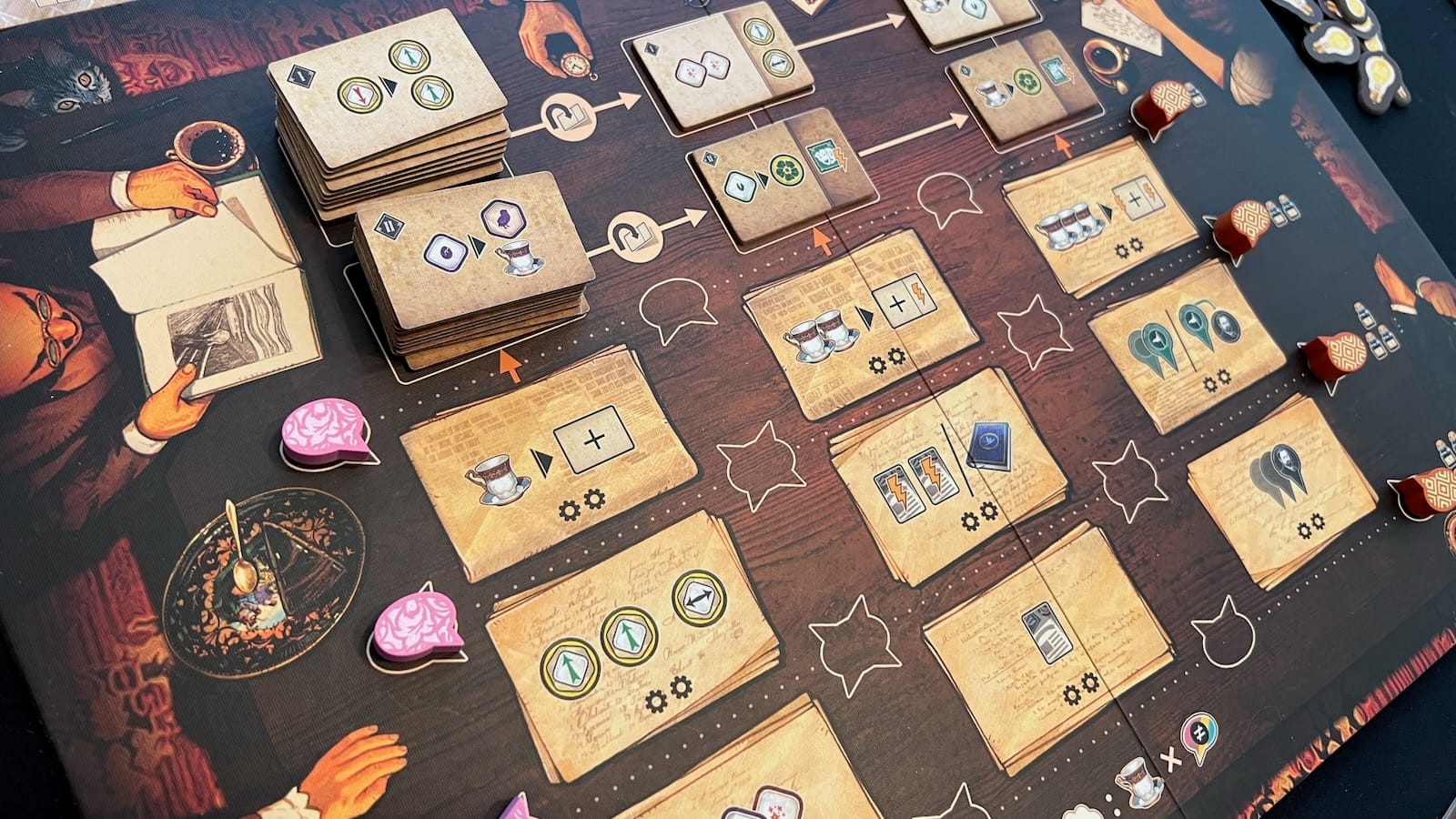 A lot of the action revolves around players placing Idea tokens, shaped in the form of thought bubbles, on a central meeting board to take one of nine different actions. Three actions allow players to research and add pages to their notebook, which give players different bonuses when triggered. Another two spaces revolve around publishing findings with one space allowing players to collect journal cards and the other space allowing players publish journal cards or collecting published works into different studies to score points. Two of the other spaces deal with gaining and upgrading Insights, which I'll touch on in a few, and the other two involve movement around the city of Vienna on another board. Depending on the row you place your Idea markers, you will move a giant inkwell around a track on your player board which will trigger bonuses built up by your notebook actions.