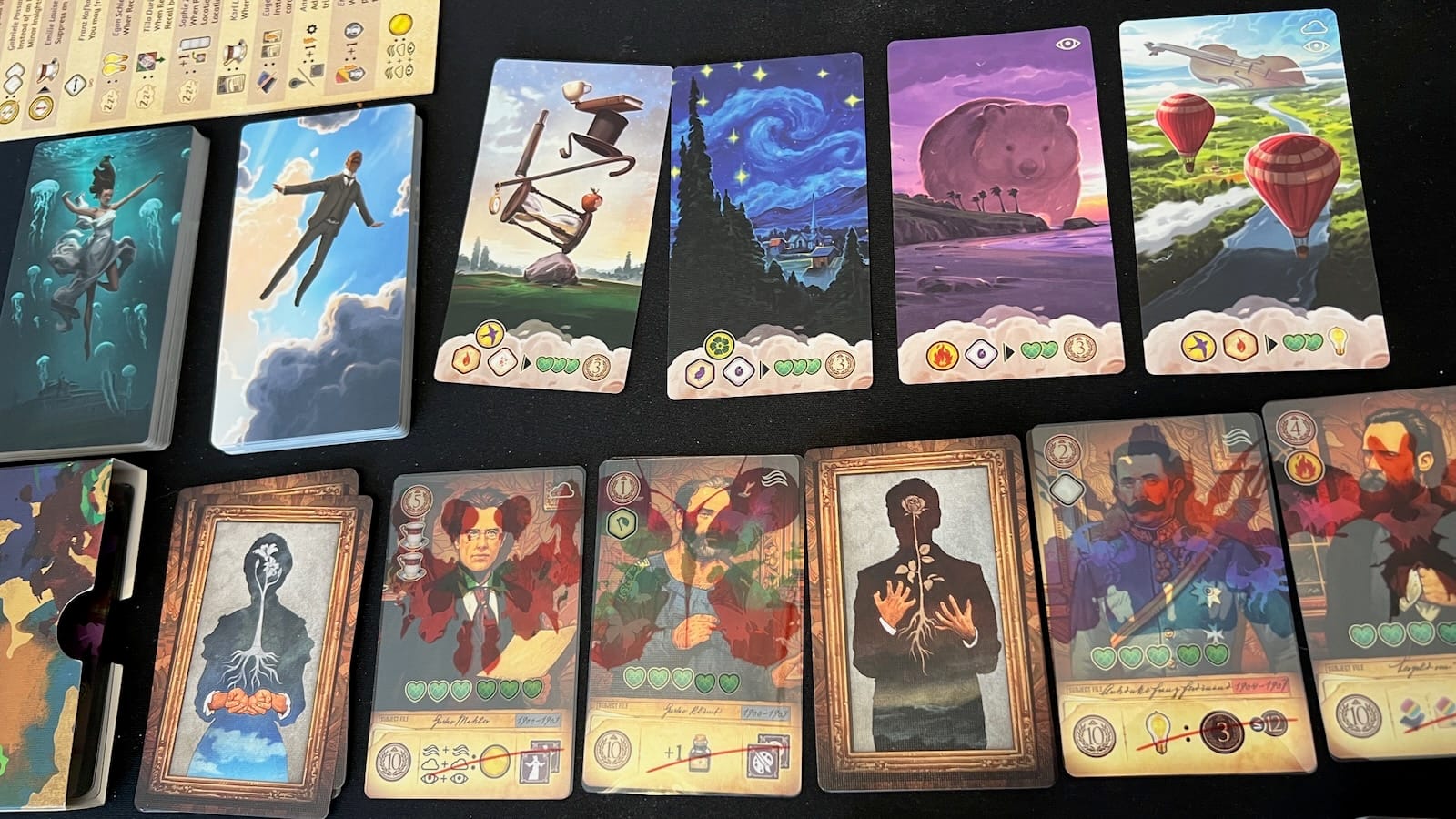 For most of the game, players will have two different patients they are treating, chosen from a common display. Each patient comes with manifest and latent dream cards and a Fear overlay that can all be treated by spending Insights. As dreams are treated, they will give different bonuses and progress the healing of the patient. If enough healing is done by treating dreams or using special Heart Shape Box bonuses, players can remove the Fear overlay and even heal the patient fully. Basic patients have special bonuses that can be triggered by other actions in the game. Case Study patients have end game scoring conditions. These patient abilities are unlocked by removing the patient's Fear and each will score points they are fully healed.