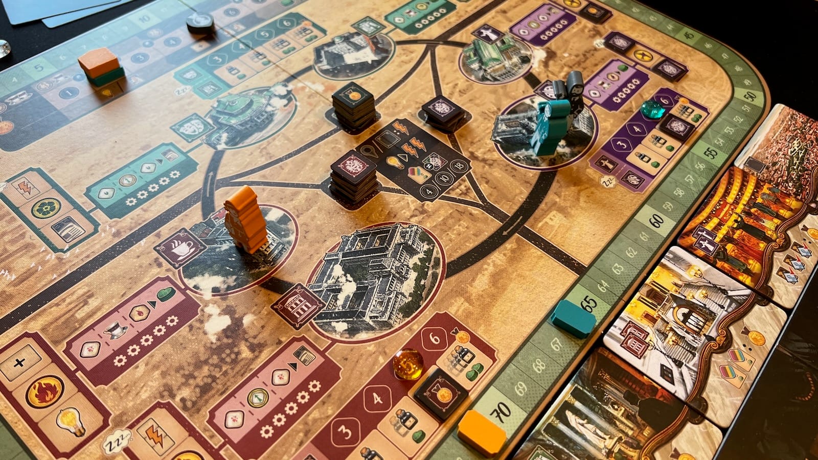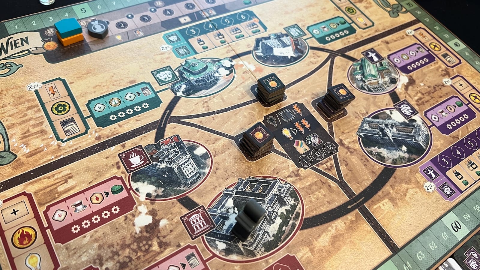 The Vienna map board allows players to visit one of six distinct districts to activate bonuses. Players can activate districts using the other player tokens already at the location or by collecting symbols matching the location through various means throughout the game. At various points throughout the game, players may want to return their idea tokens to their player board. When this happens, depending on where their player token is in Vienna, players will place a district marker on a special bonus or if they have collected enough matching symbols, a special track that gives points at the end of the game.