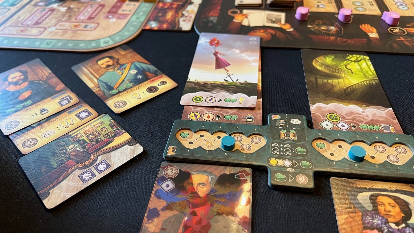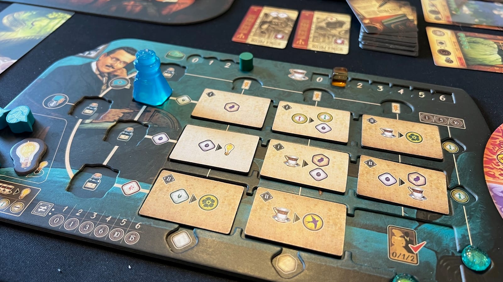 Let's start with the production. Unconscious Minds is a beautiful game. The artwork by Andrew Bosley, Vincent Dutrait, and Yoma invites you into the early 20th century. Each of the boards has small, beautiful details that add to the flavor of the game. The dream cards have shades of classic artwork twisted in ways that only dreams can. Some of the discussions around the game table were interpreting what the patient might be dealing with by looking at the combination of dream cards they collected. The rule book is fairly easy to follow and I was thankful for the many gameplay examples used throughout. The included player aids also made interpreting the many different icons used throughout the game easier and were a welcome addition. The components of the game fit nicely in the box, but you need many many bags to fit each of the components. The game did come with a nice organizer for the player pieces that fit the distinct inkwells, glass tokens, track markers, and idea thought bubble tokens nicely. The patient track boards also fit nicely into the lid. Most of the tokens were nicely produced, but an opportunity was lost making the Bright Idea tokens cardboard when everything else was made of wood and plastic. Maybe it came with the Kickstarter version? My biggest complaint about the production of the game has to be the sheer size of the game. With two main boards, player boards spread over three different sections, and multiple tableaus of cards and tiles spread out on the table, this thing takes up a lot of room. When playing with four people, we had to use the biggest table in the shop to fit everyone comfortably. When my wife and I played, it would have been difficult to add another player to our home table.