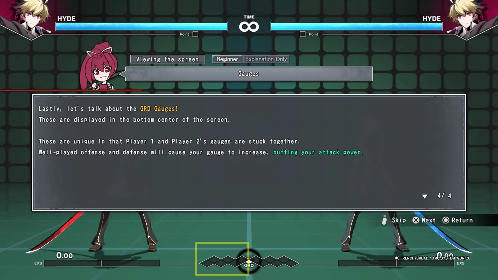 GRD is the heart and soul of UNI. A GRD gauge sits at the bottom of the screen and it acts as a simplified visual representation of the match. The meter fills by playing the game in an advantageous way – everything from landing attacks to blocking fills it up. The same goes for your opponent – that’s where things get interesting. UNI gives benefits to whoever fills their GRD gauge fastest, which comes in the form of being able to convert some of your gauge into special actions or even unlocking a specialized state called “Vorpal” that makes your character stronger. This system not only translates the pacing of a fighting game match into an intuitive shorthand, but it also incentivizes players into playing the game properly to gain extra benefits.