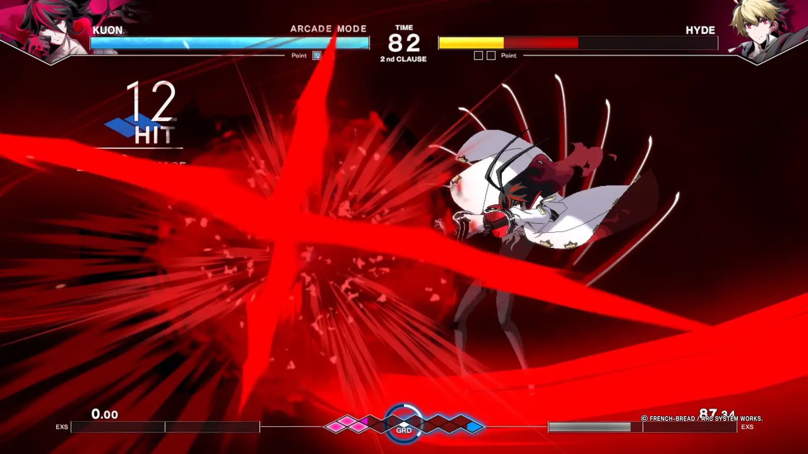 Celestial state pushes the “Vorpal” concept a step further. Normally, you only need more GRD blocks filled than your opponent when a periodic timer ends to reach Vorpal. If you have six or more blocks filled, essentially when you’re totally dominating your opponent, you’ll instead enter the Celestial state. This powerup buffs your damage and gives you 12 GRD blocks to work with, transforming you into a truly fearsome beast.