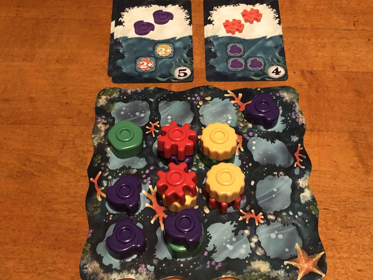 When you play a card, you first play the coral pieces on the top portion. The two pieces are taken from the supply. Each piece can be placed on any blank space or on top of any piece as long as the resulting stack isn’t taller than four pieces. Once the coral pieces are placed, the pattern at the bottom of the card is scored. Looking at the board from overhead, you score for each time the pattern shows up without being overlapped. This means that a straight line of four coral pieces will not score twice for a pattern of three of that color, just once. Patterns range from looking for a group of the same color in a particular shape to looking for colors at a specific height. The more difficult it is to create the pattern, the more points it will score.