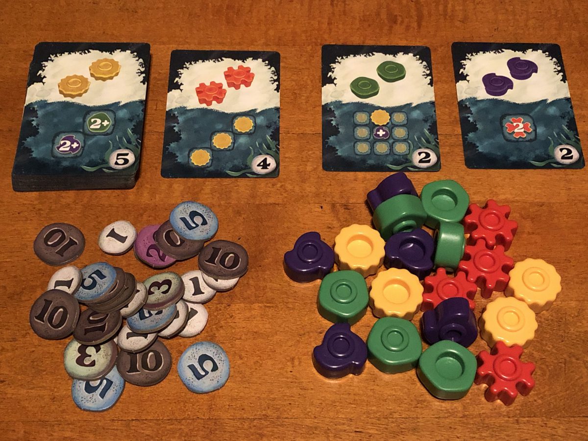 The components for Reef are simple. The coral pieces come in four colors: yellow, green, orange, and purple. The plastic pieces feel solid in the hand, and the rings on the top and bottom allow them to stack. A number of each color depending on the player count are placed on the table. Each player gets a player board, which is essentially a four by four square grid. One of them has a starfish to indicate the first player. Each player takes one coral piece of each color and point tokens are used to keep score, with the different denominations coming in different shapes, with each player getting three points at the start. Finally, each player gets two cards with the rest making a face up deck. Three cards from the top are laid to the side of the deck, making it so four cards are visible.