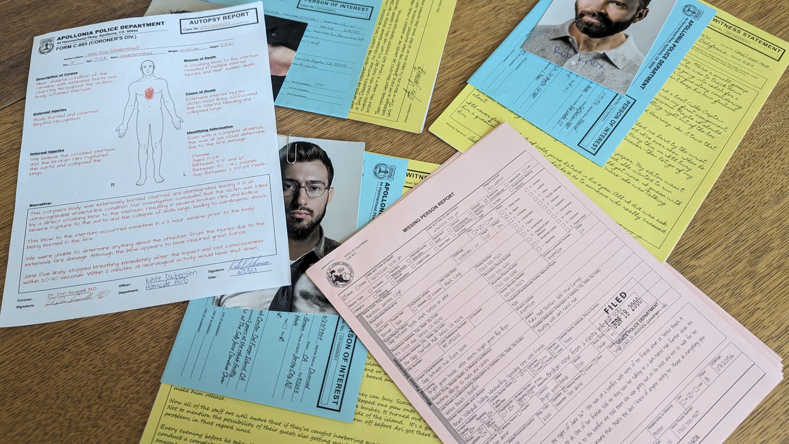 Unsolved: Jane Doe has you solving a fictional 90’s cold case of a charred corpse discovered after a fire on an island resort rehab outside of LA that pandered to the rich and famous. The titular case file contains a suspect dossier on each of the major players, several relevant missing persons reports, a picture envelope with some headshots, a few other pictures and a magnifier, and a few other loose sheets. It attempts to organize itself into a three-act structure, with three successive questions the game asks its players: how did Jane Doe get to the island, who is Jane Doe, and who is the murderer? Each of which open an envelope with clues to the next or the murderer’s confession, which is the right way to approach this. The problems with that are that a questionable production decision makes the first question a shoo-in and the second question is extremely dependent upon players’ outside knowledge. That question worked out fine for me as a player but left a bad taste in my mouth as a reviewer. I knew the right answer, so for the sake of thoroughness, I checked the hint, and it all but lit up the answer with flashing neon lights. I personally prefer starting with obscure hints and escalating, but the binary “get it or don’t” nature of the mysteries here meant they kinda had to go hard with the hints. By the time we got to the finale, there was no workup to an actual suspect in the first two acts’ envelopes so while we figured it out, we were left just looking at each other saying okay? Yay us? There are other pitfalls, like multiple instances of what I’d assume is unintentional hilarity in the horrible poem Fire King, and the interrogation where the detective shouts “I think you’re the fire king!” Which took us out of the game a bit, but nothing as bad as the sheer volume of stuff in this box that goes totally unused due to how it plays out.