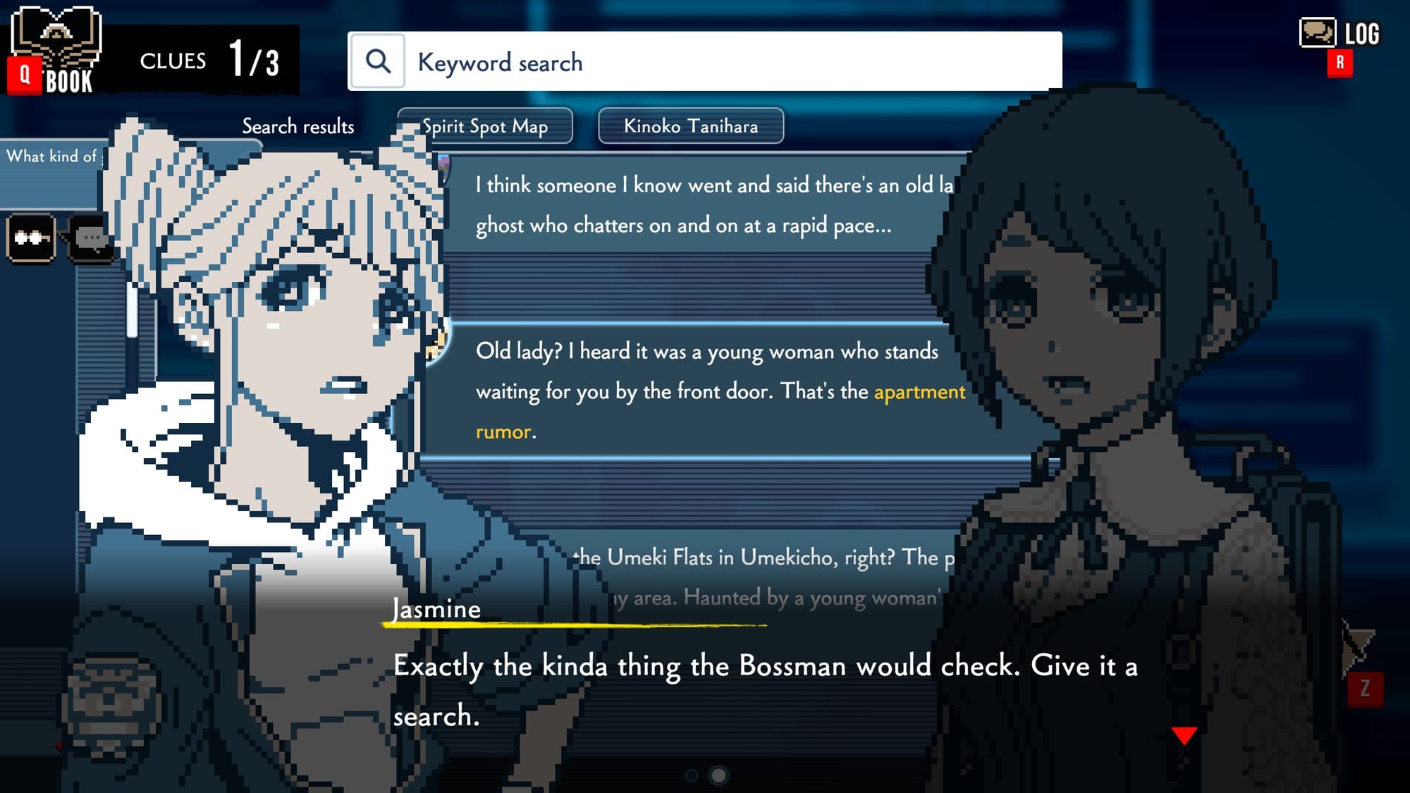Once you've completed the research, you'll be able to go hands-on with the investigation. It's here that Azami shines as she has access to a mysterious ability called Clairvoyance that allows her to see traces of people in the past. These often take abstract forms, but give hints as to what suspects may have been doing when the crime was committed. The investigations themselves often involve just clicking around the environment and gathering clues, along with interviewing people on location. After the initial search is finished, the Urban Myth Dissolution Center Director rings you up to ID the urban myth. This section has you answering a few questions to nail down the nature of a crime, which can then be attributed to a popular urban myth.