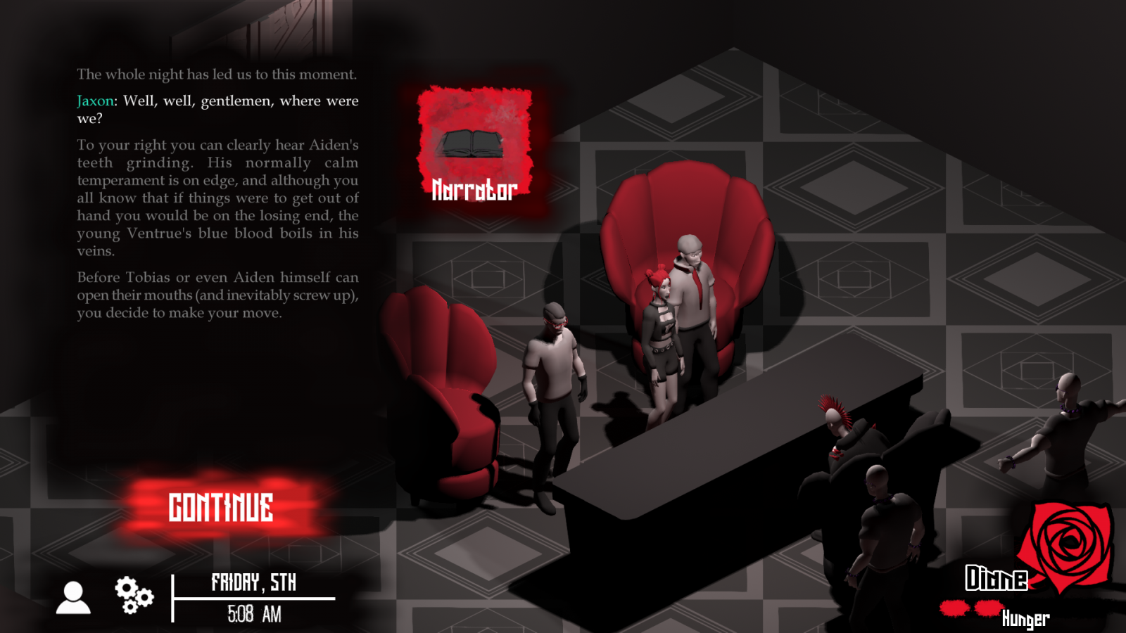 Within those 45 minutes, you’re free to walk around the club, interact with things, and most importantly progress the story. You can press tab to see what you can interact with, which admittedly isn’t much, but a few people and objects have multiple choices or skill checks attached to them. Skill checks factor in your stats with a dice roll, but since you can’t build a character they’re just random chance. It’s an interesting system to build off of, since this was a game jam experiment, but it feels a little pointless here.