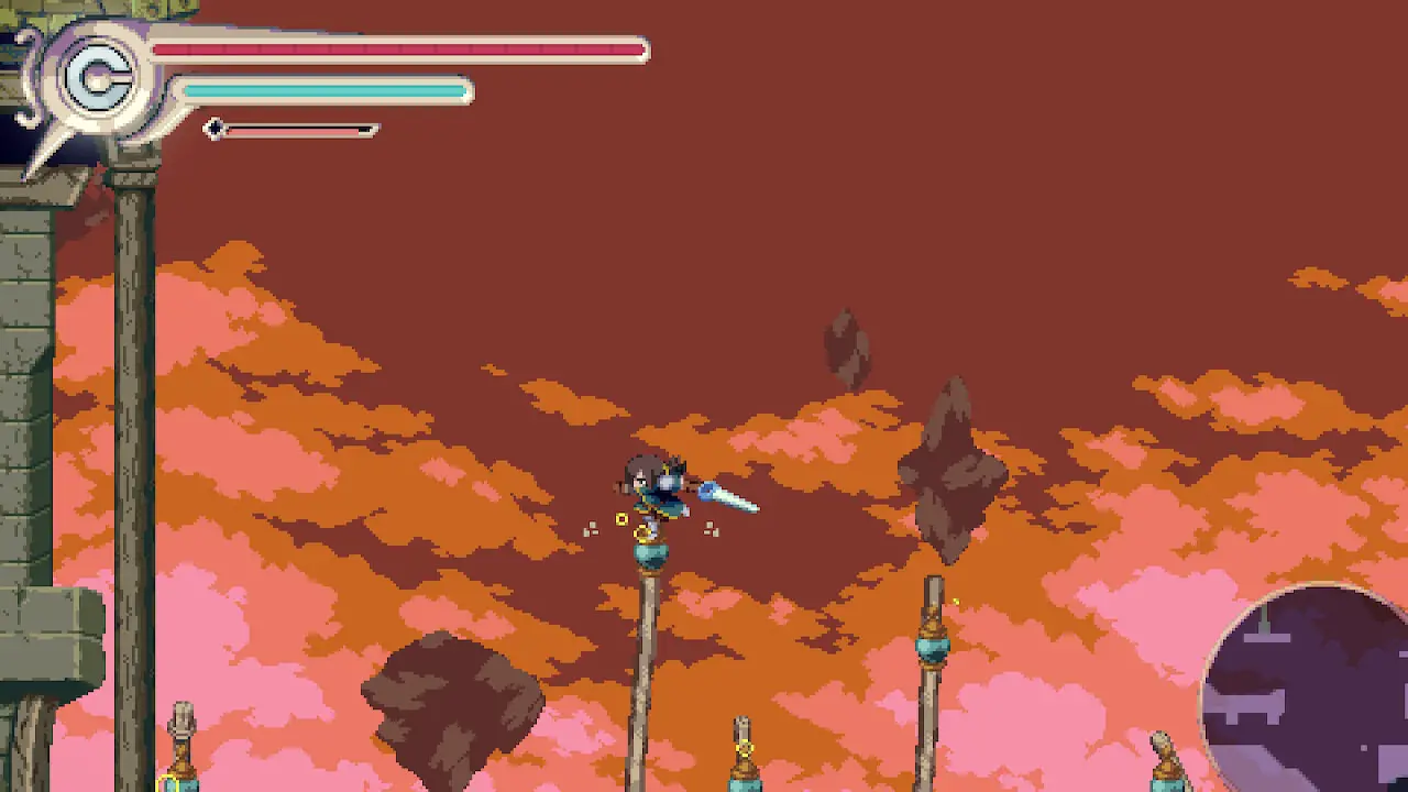 In Vernal Edge, you play as Vernal, a girl out to kill her father after he left her and her mother to die before she was even born. Along the way, she meets Cherval, a robot housing a human soul, and the two steal an airship to find Vernal’s dad. Story’s not really the focus here, but it’s a decent tale of revenge that’ll see you to the credits. The game is instead mostly about combat, exploration, and platforming.