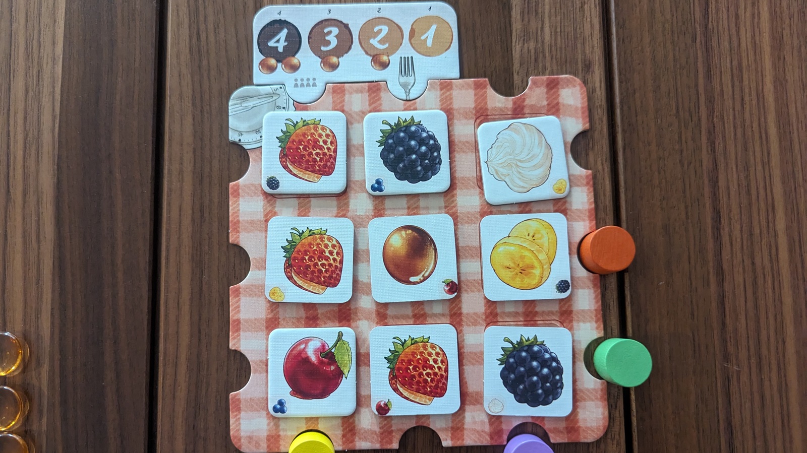The core scoring is also deceptively simple: you earn one point for each space with a syrup bead on a fruit token, and you earn three points for a syrup bead on a fruit on cream. How do I get syrup on my fruit and cream you ask? Each game contains a pattern for each type of fruit and as players complete a pattern for a specific fruit that pattern card will allow them to place syrup beads on those fruit. In addition, each game will have three overall goal cards that will earn players bonus points at the end of the game with the first player to complete each one receiving an extra two points in the form of a butter token. These goals can be patterns or specific combinations of fruits. Lastly if your syrup dispenser is empty at the end of the game a player will receive two points.