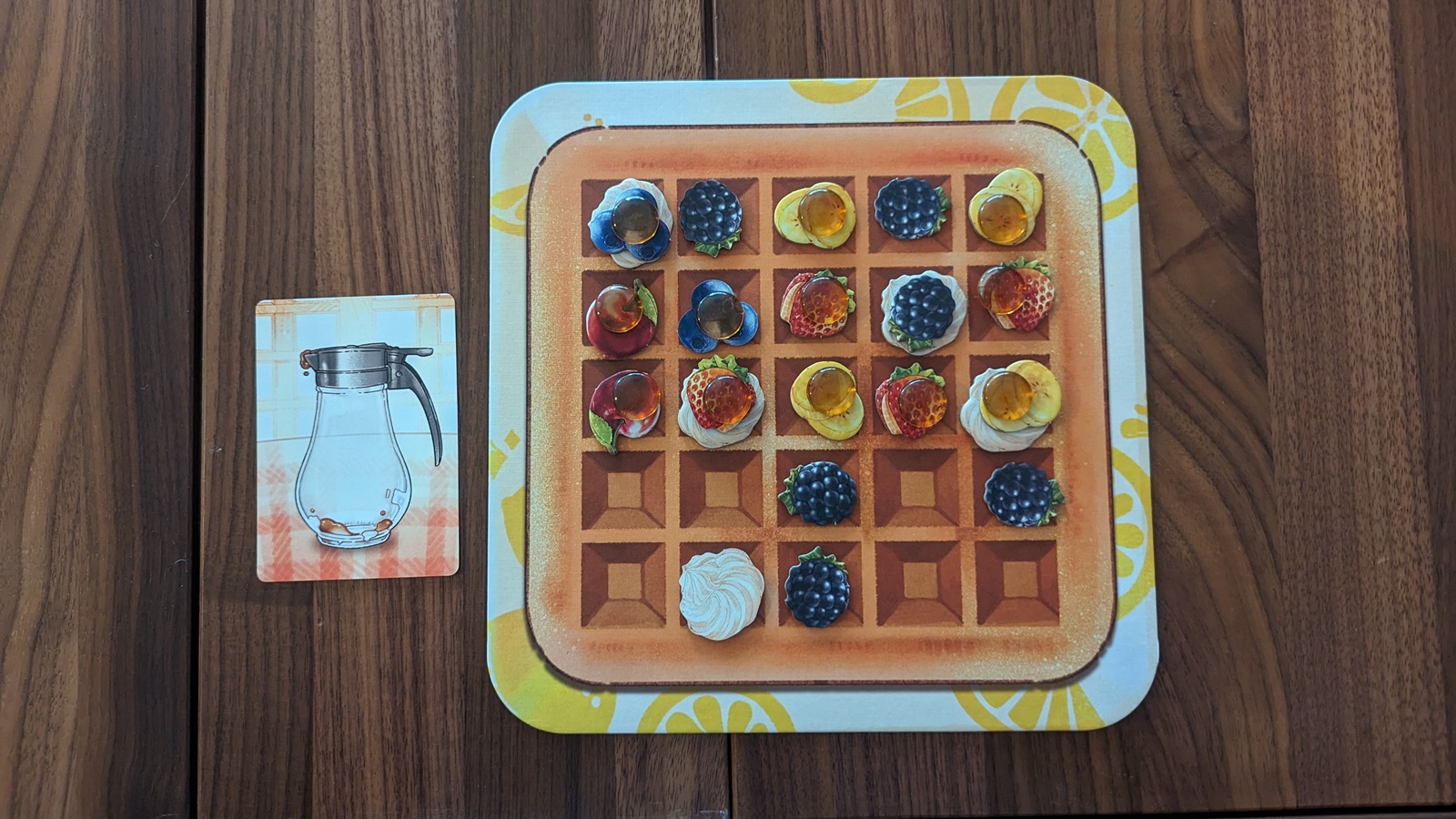 Overall, Waffle Time is a simple game of creating patterns and trying to maximize your syrup for points. While it is possible to be blocked from the space you want, there are usually enough options that your turn never feels spoiled. Turns are always quick and the game is easy to learn. The changing fruit patterns and objectives provide enough variation so that the game keeps its freshness. I found Waffle Time a fun little puzzle to solve each time I played it. The artwork for Waffle Time helps reinforce the game’s fun lightweight nature. I found the fruit tokens quite charming and the syrup beads look shockingly tasty atop the other tokens. The lighthearted joy of watching your waffle overflow with toppings was also something I observed with a lot of players. By the end of each game, someone would always want a waffle. Lastly, the rulebook does a good job of explaining the game and even has a card clarification section. While Waffle Time isn’t a complex game, I appreciate any rulebook that takes the time to clarify as many individual components as possible.