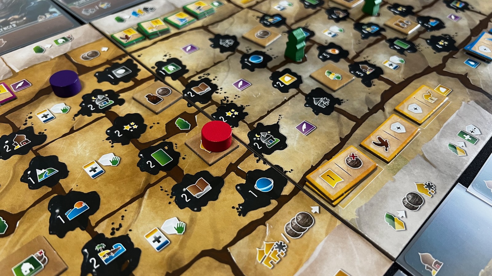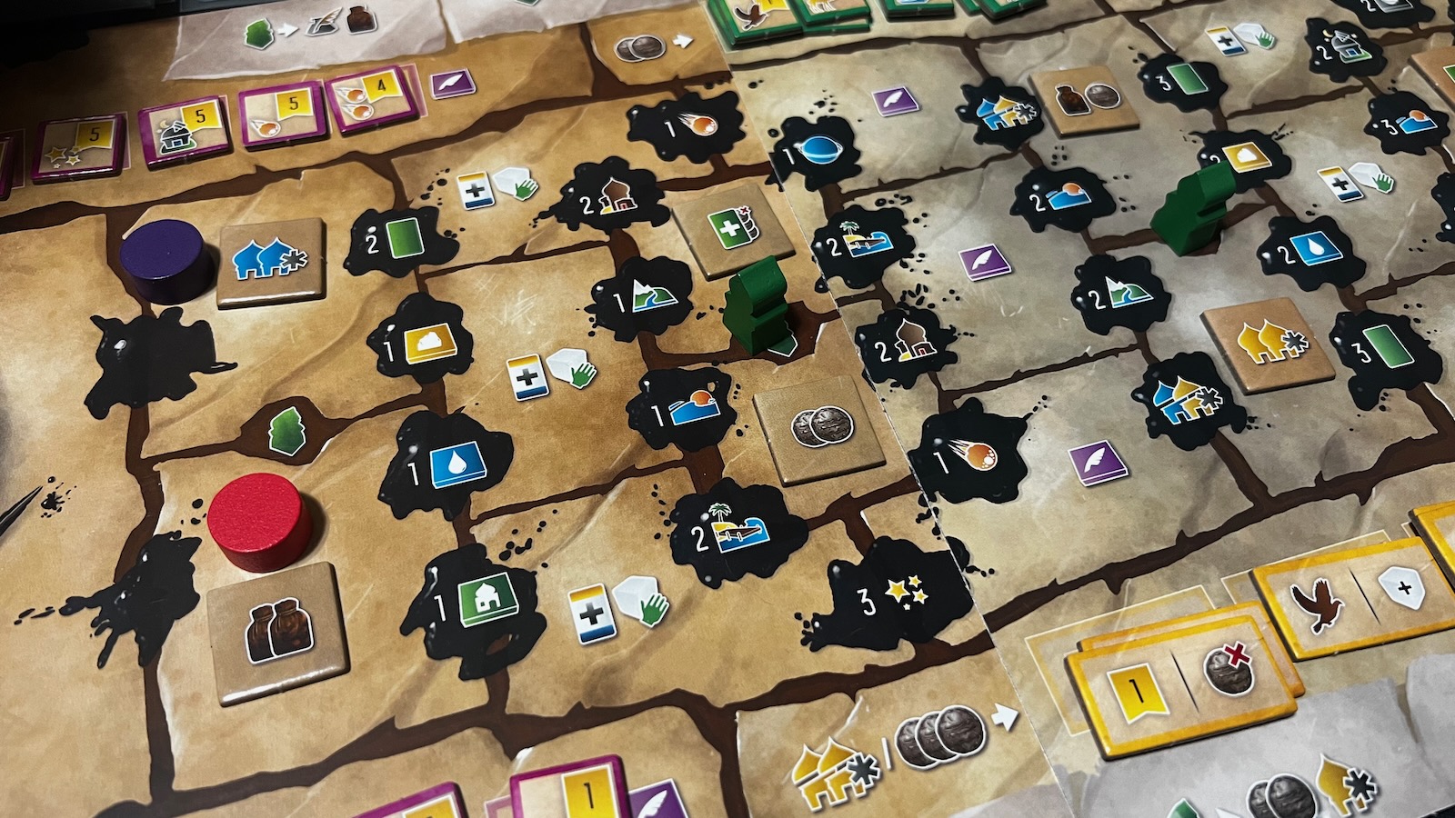 The production quality for the game is what you would come to expect from Garphill Games. The iconography is clear and uses familiar images from past games. The iconography is featured on the back of the rulebook for a quick reference, and it doesn’t take long to understand what everything means. The designers brought back Mihajlo Dimitrievski to do the artwork, as he did with the other two series, and he continues to bring a welcoming aesthetic to the game. The familiar look of the townsfolk is like greeting old friends in different costumes. The inclusion of double sided main boards and player boards adds a variable element that is not seen in many Garphill games. Each player board has a different layout of caravan bonuses and the ability to change journal tiles around on the main board makes each game a little different. The only thing I would change about the production is the box insert. The upgrade tiles are small cardboard bits and they are difficult to get out of the insert when setting up. There are extra spots that would make it easier, but I’m holding out hope that those are meant for a future expansion. The main board and player board components do not make a very tight seal on the player pieces in the insert so each game I am constantly having to re-sort player pieces by color and get them back where they belong.