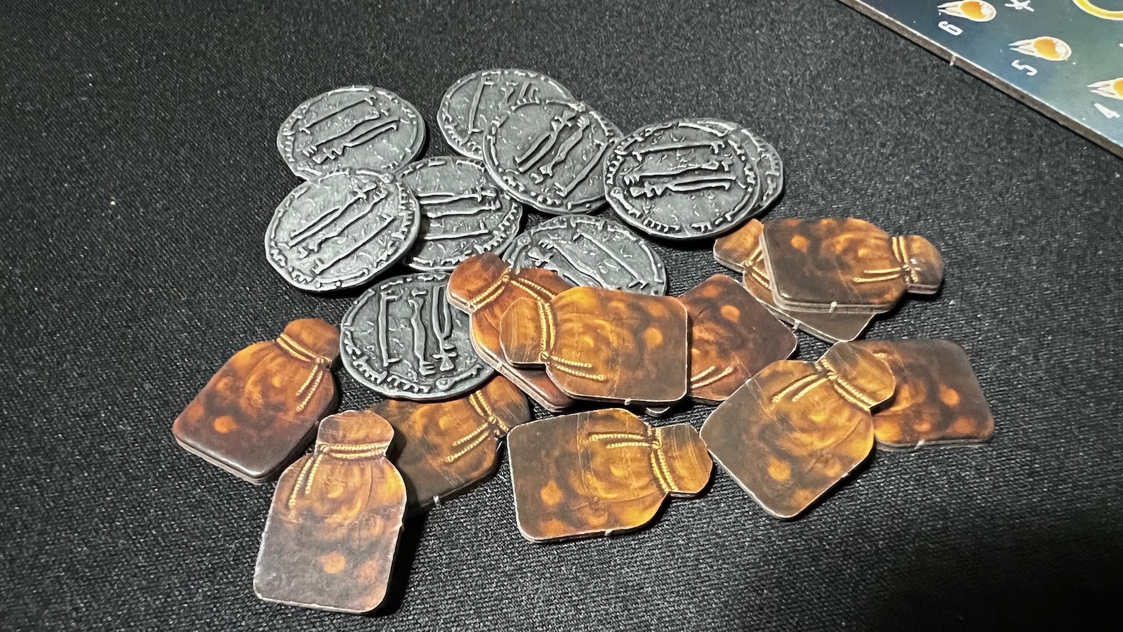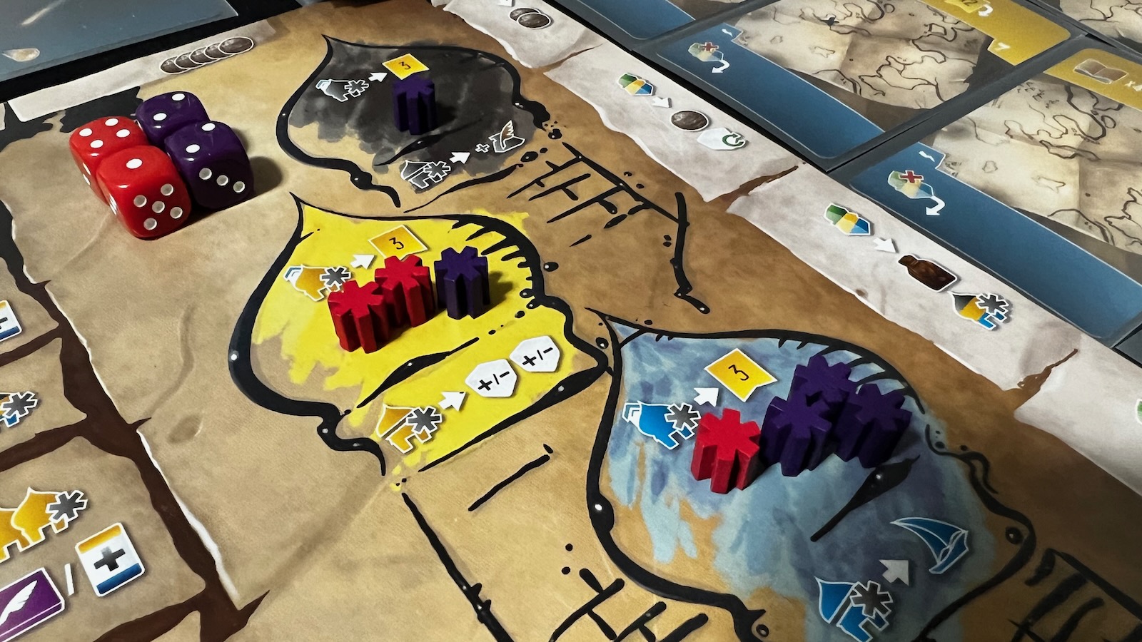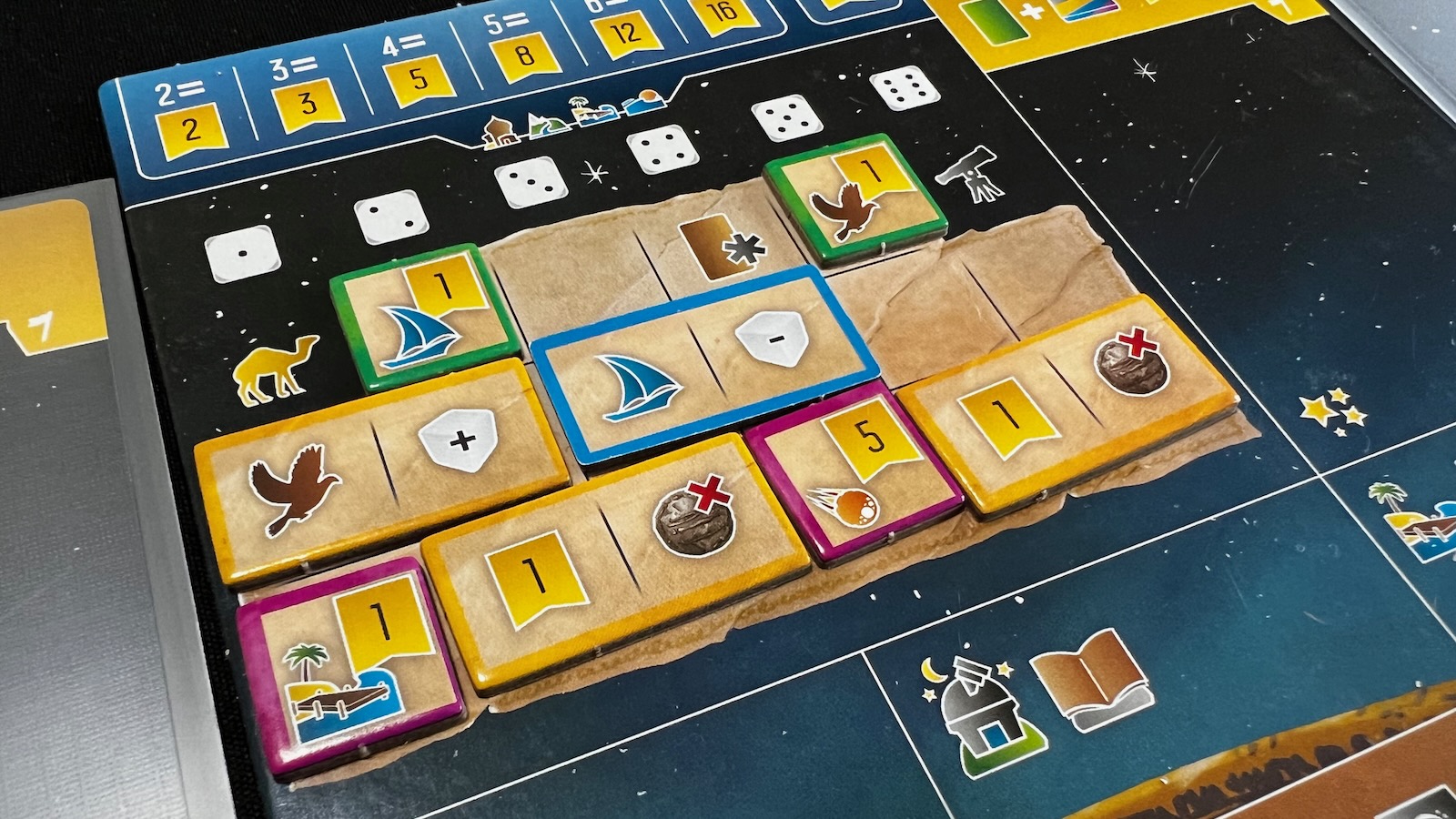 Players have 15 influence tokens to use in the game. Influence can be placed on cards causing other players to pay silver or resource tokens to use an influenced card. Players also place and move around influence tokens on three guild spaces on the main board. Once per turn, players can remove an influence to utilize a guild’s special ability. The black Space Guild allows players to journal a second time when the journal action is activated. An influence removed from the yellow Trade Guild allows players to change the value of their dice twice. The blue Exploration Guild gives players a Ship tag when placing dice on the board, but more on that later. Influence is a fun way to manipulate how other players may take turns by pushing them towards specific actions. The player with the most influence in each of the guilds at the end of the game will also score some extra points.