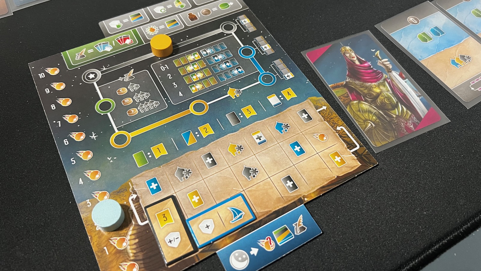 Wayfarers introduces the mechanics of dice placement and manipulation. Dice will also be used in different ways in the planned Scholars of the South Tigris in 2023 and Inventors of the South Tigris in 2024. In Wayfarers, players use dice as workers that can be placed in a variety of different spaces on individual player boards and cards acquired throughout the game.. In the rulebook, rather than going step by step through player turns, the designers discuss a lot of the different concepts at work in the game first. By the time you get to the player’s turn, you know why you are taking the actions, and the instructions flow smoothly. There is also a great iconography page on the back of the rulebook to help players during the game. What better way to continue with this review than to follow their lead.