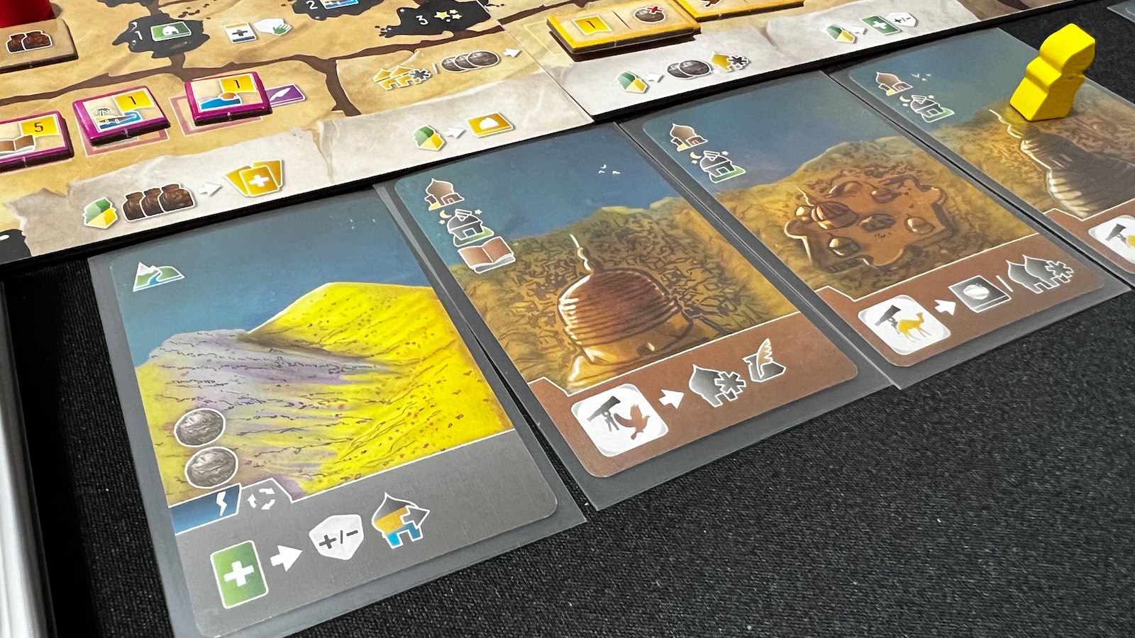 Land cards featuring different tags. Worker placement actions visible on the edge of the board.