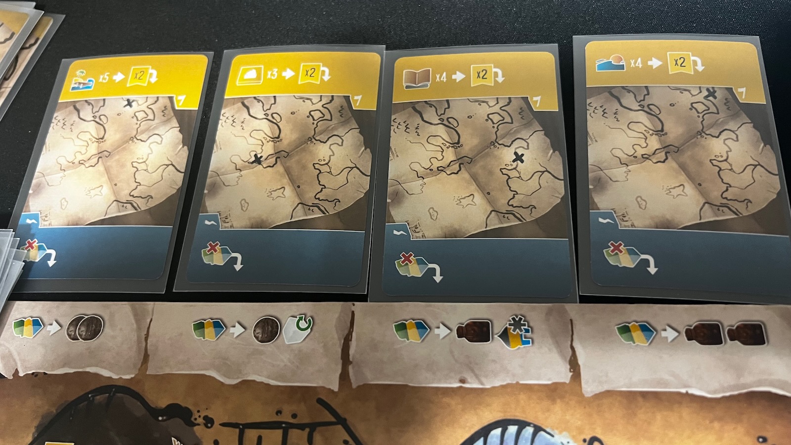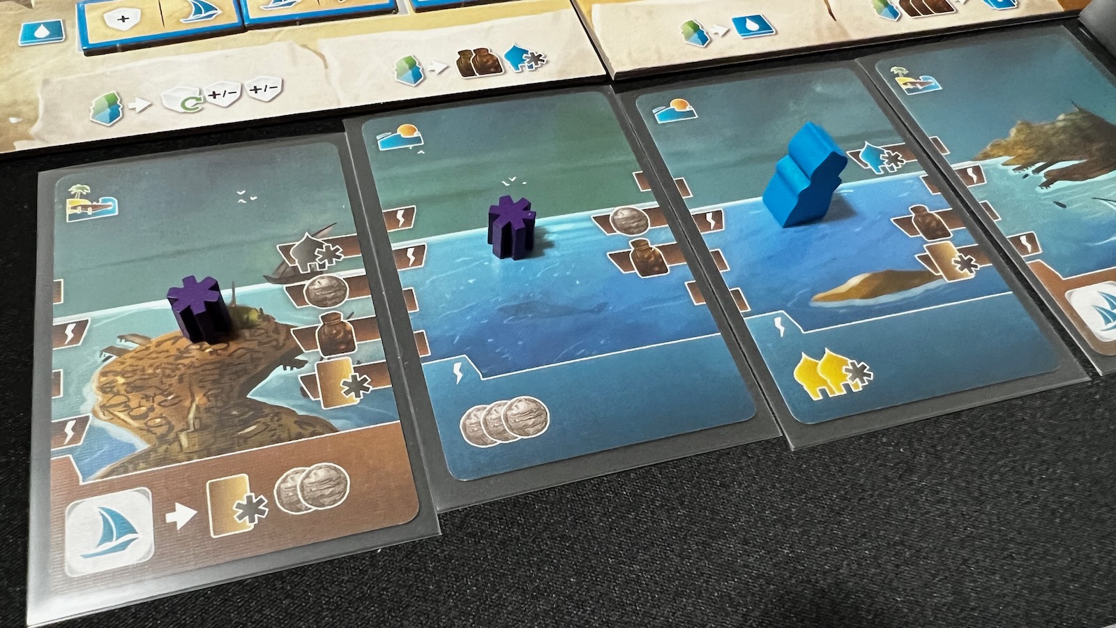 Water cards have harbor and open water tags and can take blue and green workers for actions on the edge of the board.