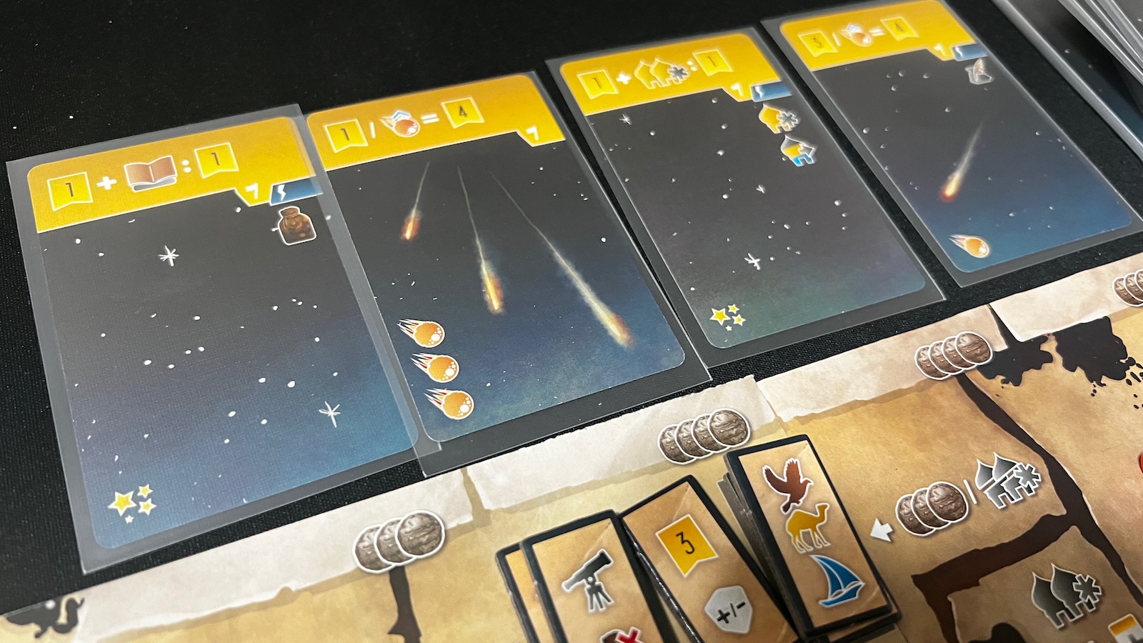 Space cards feature a variety of tags and are acquired for end game points. The Sun and Moon are singular cards in the deck and can give big points if a player has both. Planets power up the more a player has. Comets each have their own point values, but the player with the most comets at the end of the game powers all his comet cards up to 4 points each. The Stars are the most common but each gives a special condition to activate the end game bonus, usually in the form of certain tag sets or number of cards of a certain type.