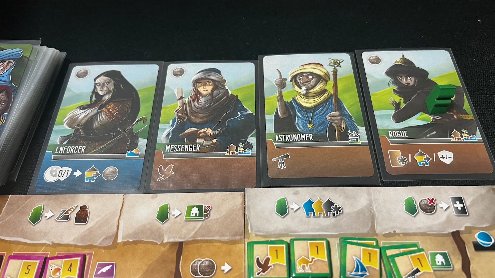 Another element that impressed me was the solo mode. The solo mode was easy to pick up and understand and played much like a two player game without much change. The backs of each of the four player boards introduced a different AI bot that focused on a different element of the game to score their points. Do they go after the upgrade tiles or journal or are they hungry for space or townsfolk cards? Each turn, a card from the AI deck is flipped and determines the AI actions. A token will move around a central track that helps determine which color card or upgrade tile the AI targets. The variability allows you to go up against a variety of different opponents and adjust to their strategy to win, which didn’t happen often.