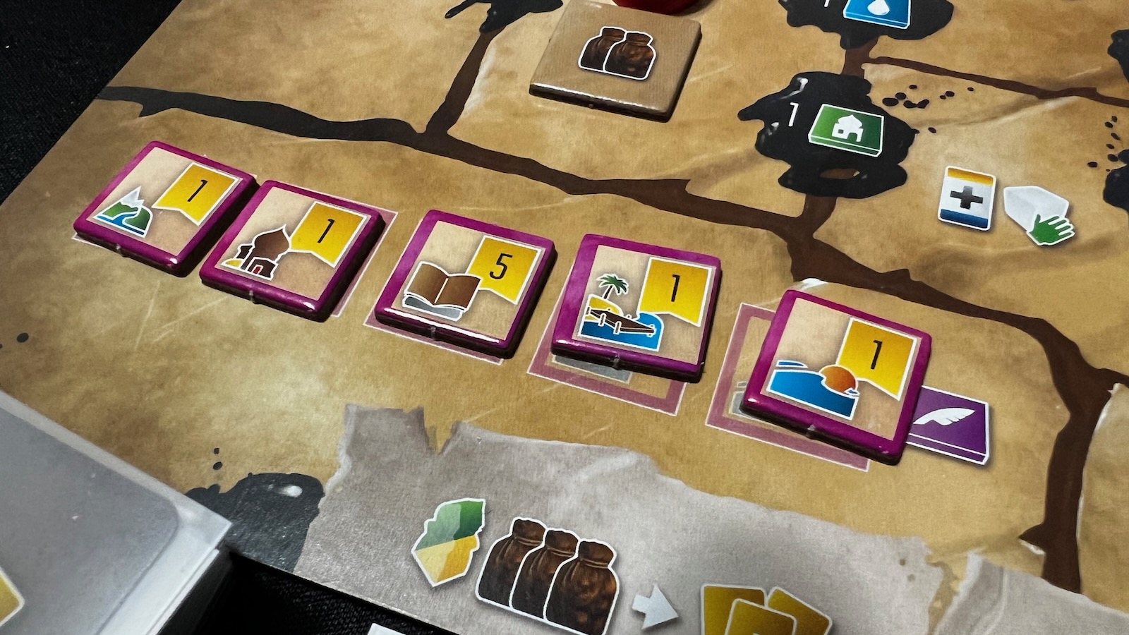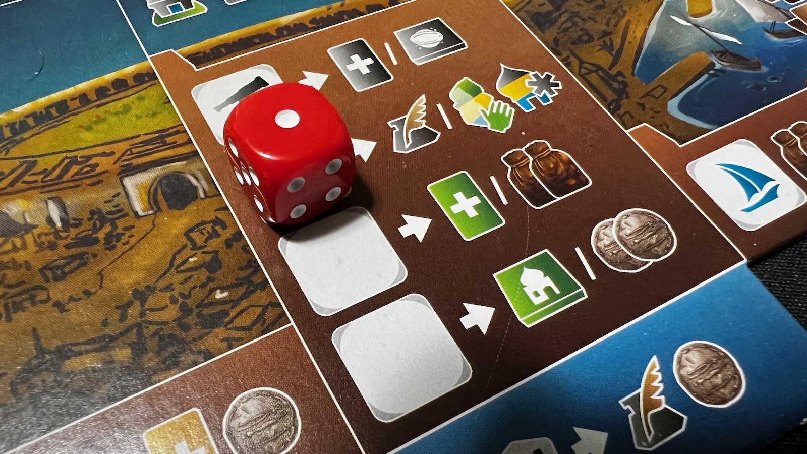 Each time a die is placed back into a player’s supply, they must roll it and keep the number rolled. Each number has a variety of abilities as shown on a player’s caravan on their player board. Upgrade tiles help power up the abilities of the dice in the player’s control. Some dice placements require a special tag for the dice to be placed and activate the card. Upgrade tiles add these tags and other abilities to the different dice faces. Other abilities are dice face manipulation, discounts when spending provisions or coins, end game points, and some feature tags that can combine with those found on cards for end game bonuses. When placing an upgrade tile, covering symbols printed on the caravan will give players some one time bonuses.
