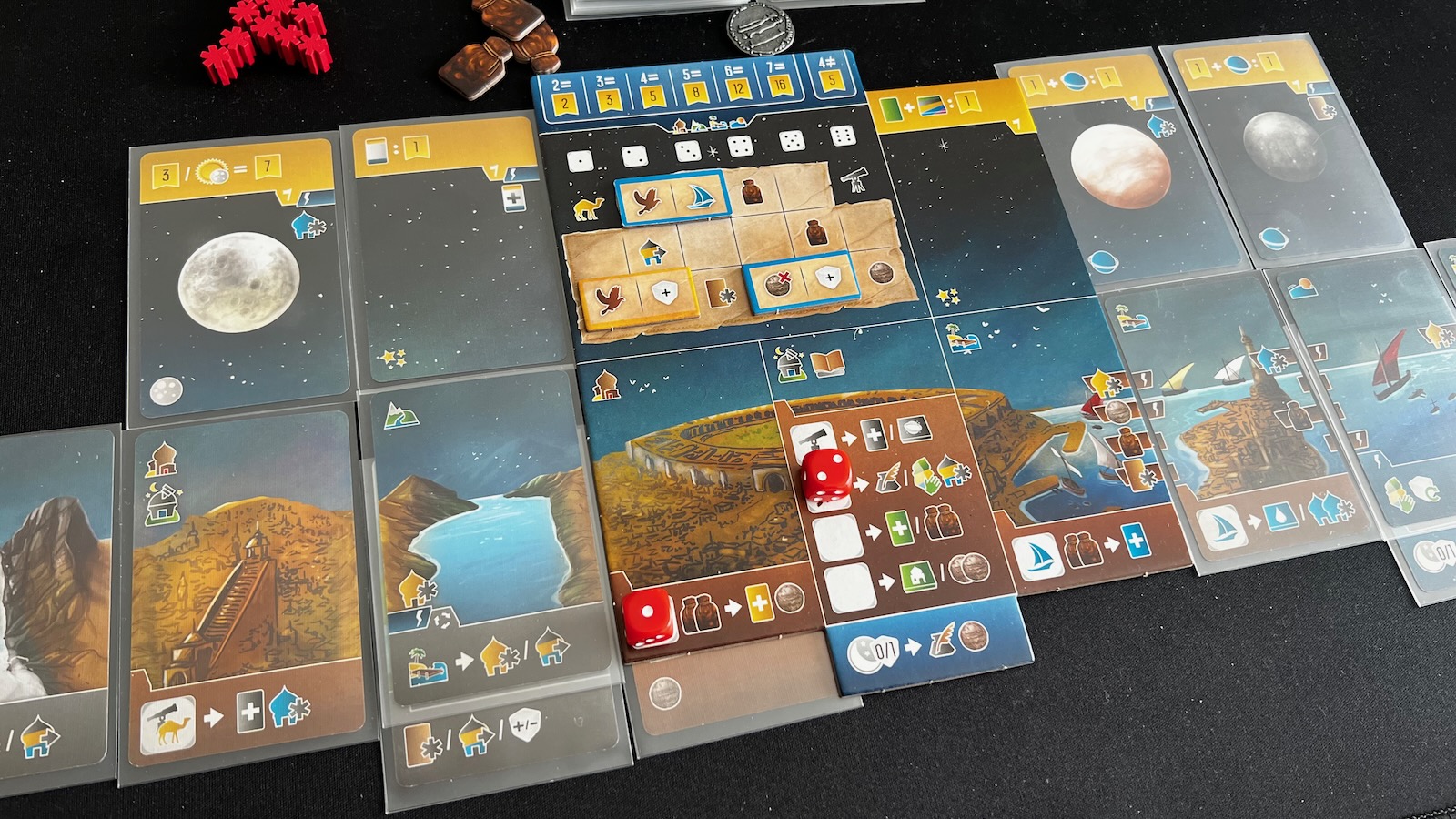 Land cards come in two types: Cities and Vistas. Cities open up a new spot to place a die and Vistas give ongoing bonuses when certain conditions are met throughout the game. Water cards also have two types with Harbors giving a new dice placement spot and the Open Water giving one time benefits to the player. Water cards also have synergy bonuses that are activated when symbols line up on the card edges when attained. Both land and water cards are placed on the sides of each individual player board.